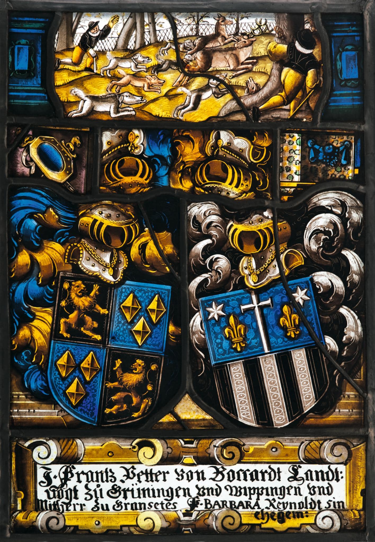 Die beiden einander leicht zugeneigten Stifterwappen nehmen die ganze Breite der Scheibe ein. Im Bereich der Helmzier ist der Bestand gestört und durch Flickstücke ergänzt. Darüber ist zwischen blauen Podesten eine ebenfalls zugefügte Jagdszene dargestellt. Zwei Jäger hetzen mit einer Hundemeute Hirsch und Reh in das aufgespannte Netz. Das Stifterpaar gibt sich im Fussteil der Scheibe in einer breiten gelbgerahmten Rollwerkkartusche zu erkennen.