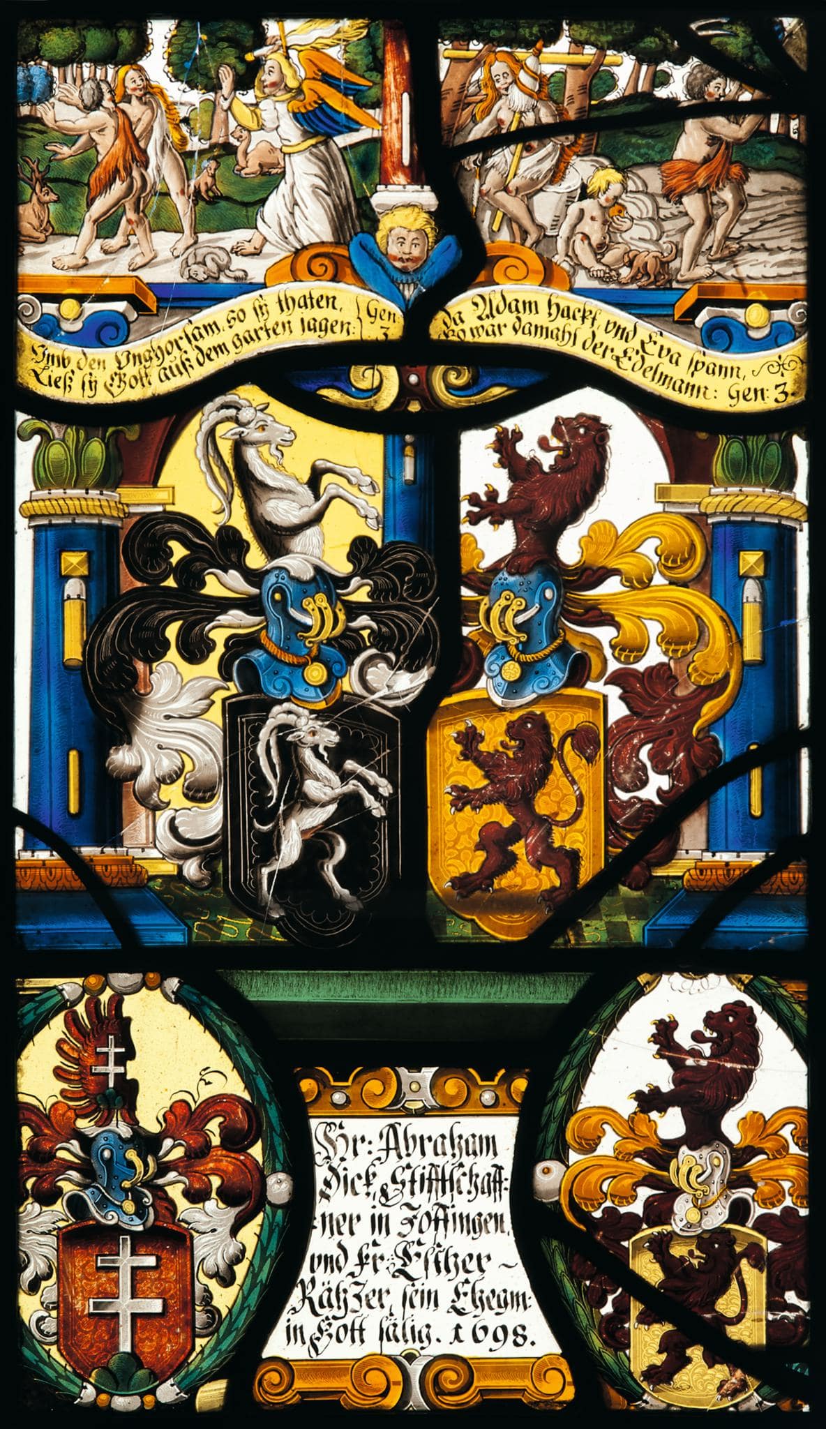 Wappenscheibe mit Inschrifttafel Abraham Dick und Esther Rätzer 1698
