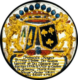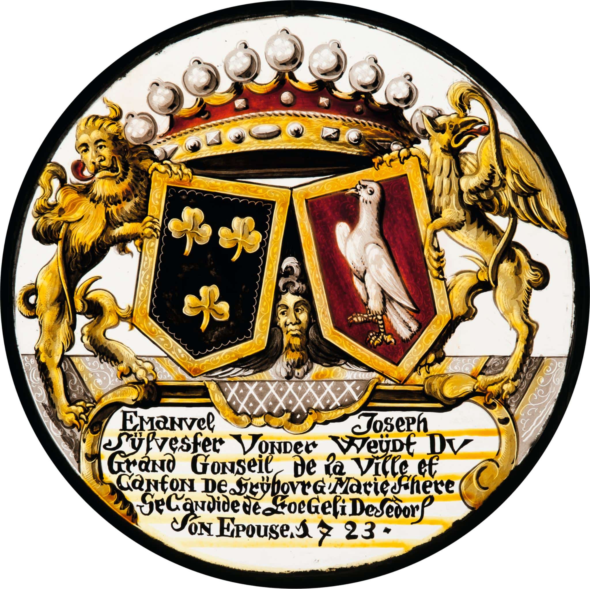 Stifterinschrift: EMaNVel Joseph / Sÿlvester VONDer WeÿDt DV / Grand GONSeil de la Ville et / CaNtON De FrÿbovrG, Marie there / Se CaNdide de FoeGeli De Sedorf / Son EPOUSE. 1723.