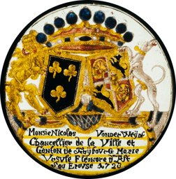 Zwei widersehende bleckende Löwen stehen auf einem Bretterboden und halten die in heraldischer Höflichkeit einander zugeneigten Wappen des Stifterpaares unter einer Freiherrenkrone mit neun blauen Kugeln. Ihre Hinterpranke setzen sie auf ein Podest, vor dem sich unter einem Vorhang und einer Löwenkopfmaske eine Kartusche mit der auf gelben Linien stehenden Stifterinschrift befindet.