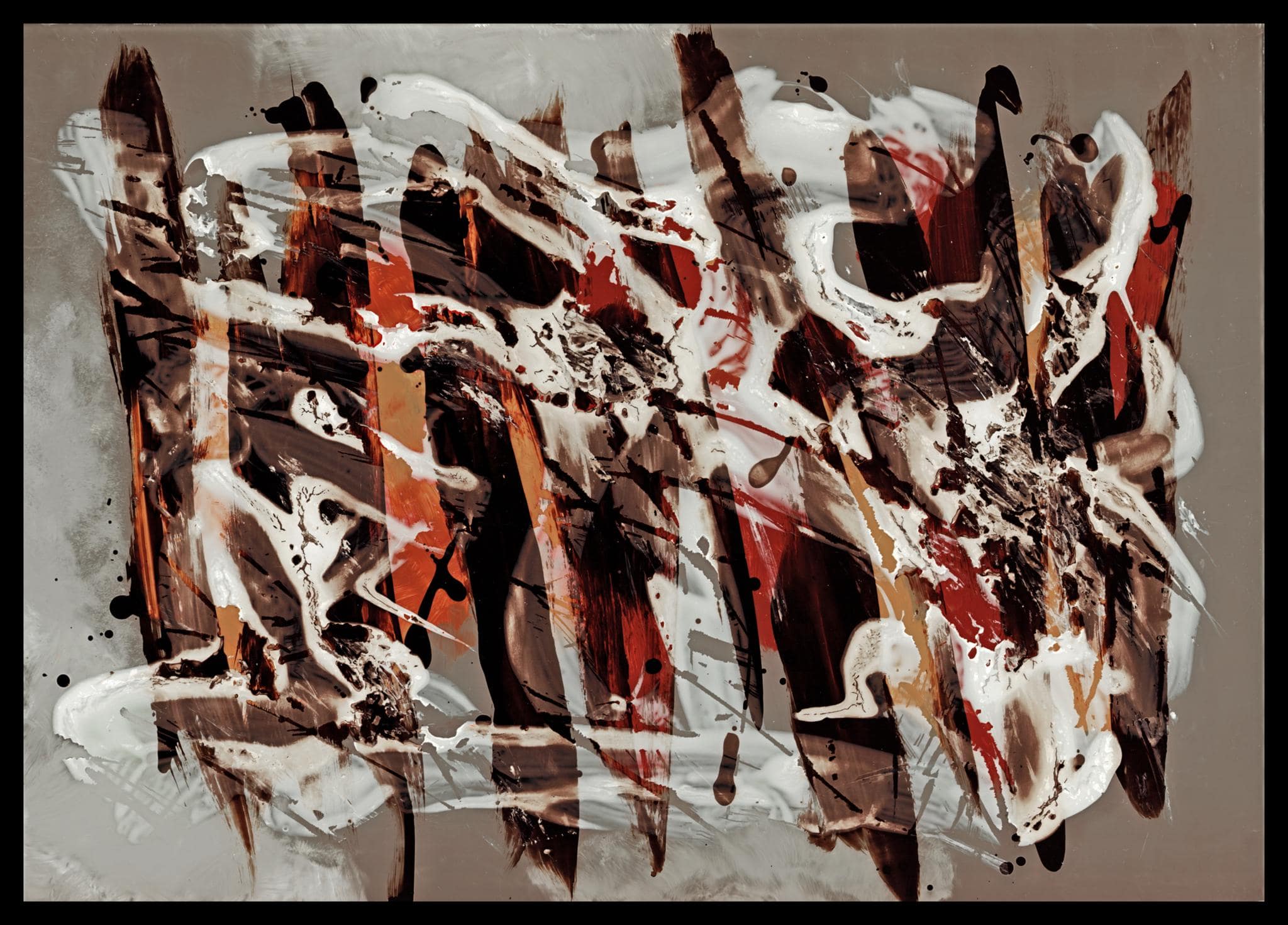 In gestischer Malerei weiße Deckfarbe und Asphaltlack; graue Deckfarbe und Acrylfarbspray, orangene und rote Ölfarbe
