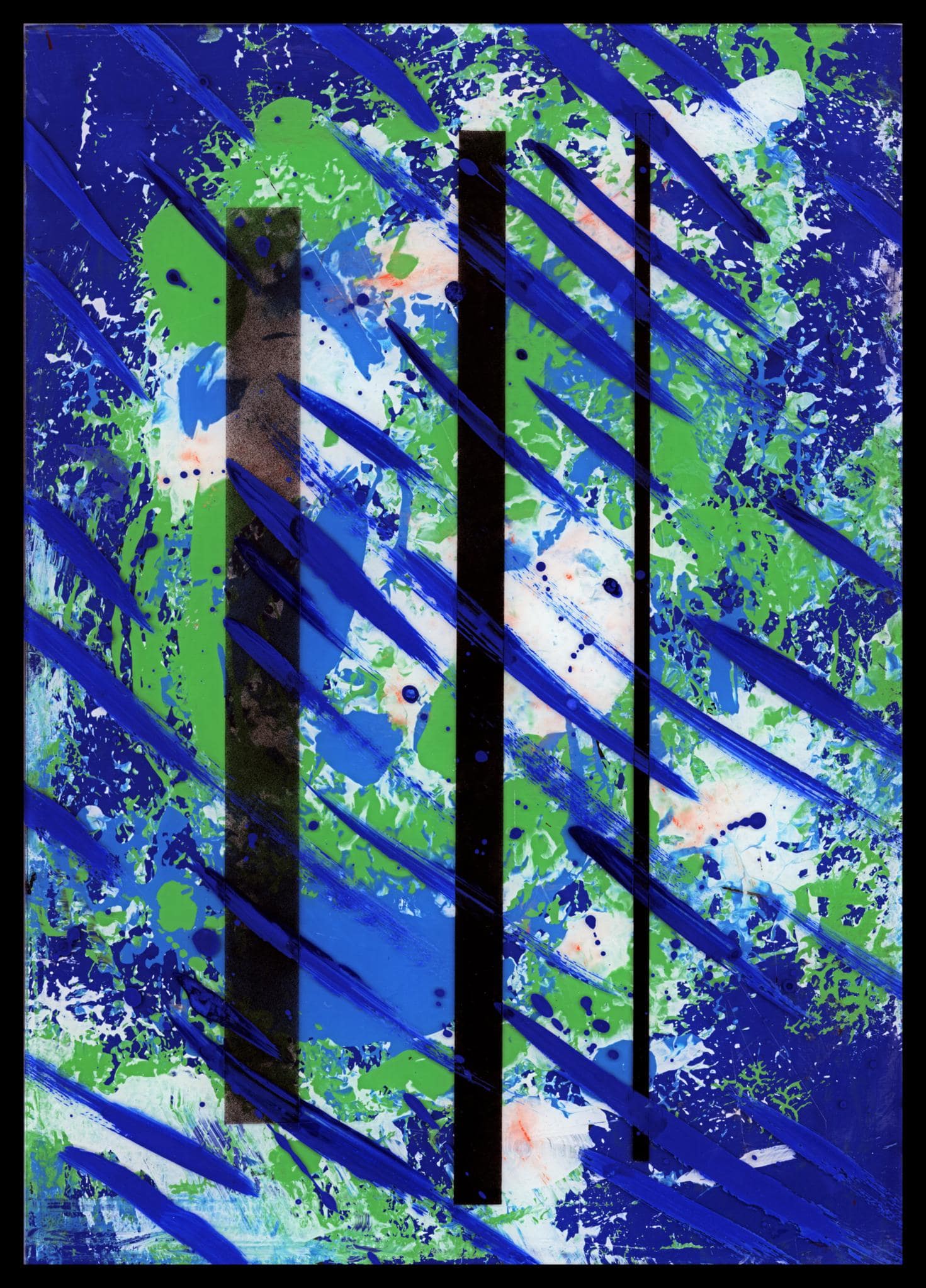Blaue Deckfarbe, in den Rechteckflächen schwarzer halbtransparenter Acrylfarbspray, weiße, blaue, grüne und in Spuren rote Deckfarben in Abklatsch-Technik