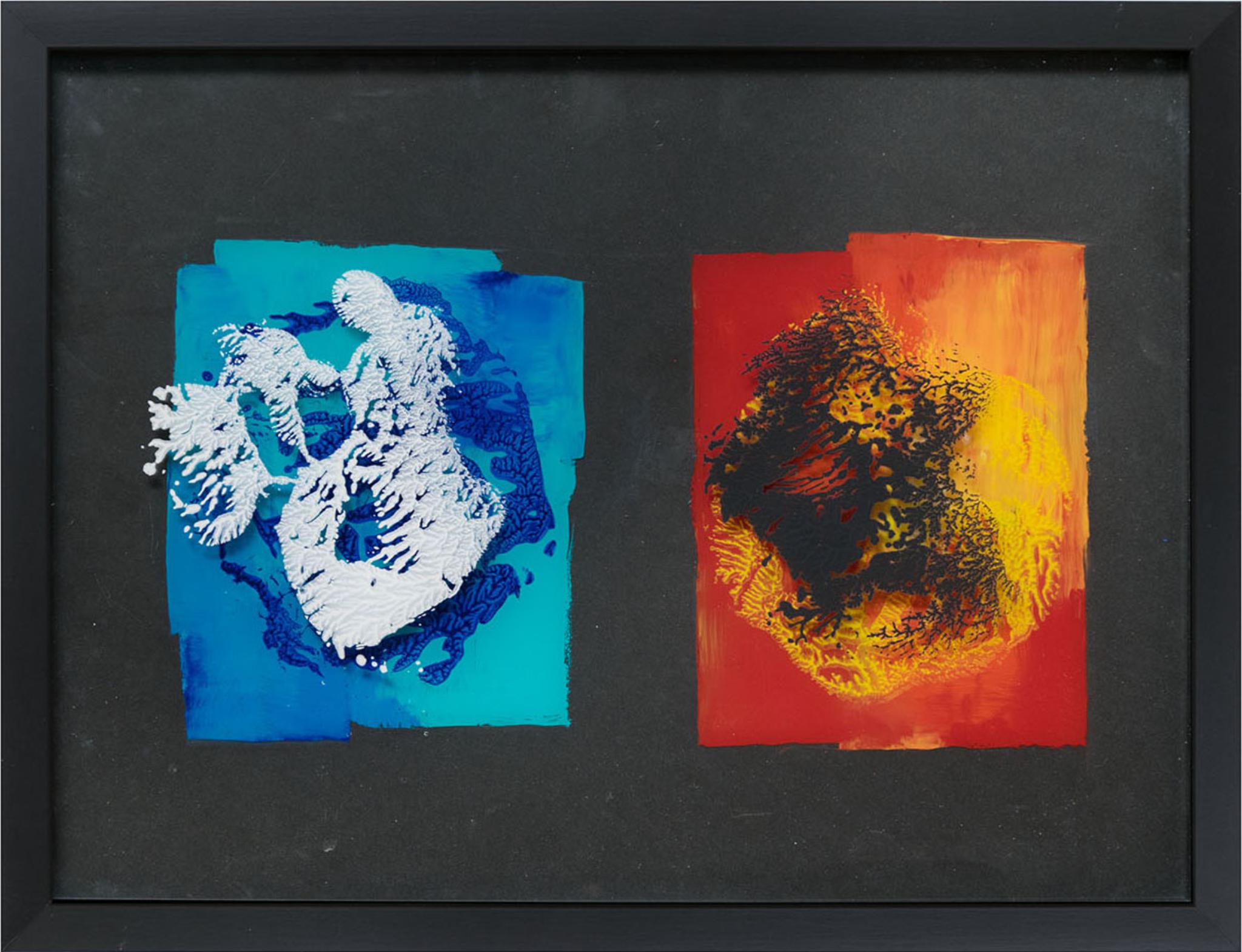 Au der vorderen Glastafel weiße und schwarze Deckfarbe im Abklatschverfahren, auf der Vorderseite der hinteren Glastafel Flächen in Ölfarbe; die differenzierte Ölfarbenmalerei steht in der linken Bildhälfte als blaugrüne Fläche hinter dem weißen Deckfarbenabklatsch, die gelbrote Fläche steht in der rechten Bildhälfte hinter dem schwarzen Deckfarbenabklatsch