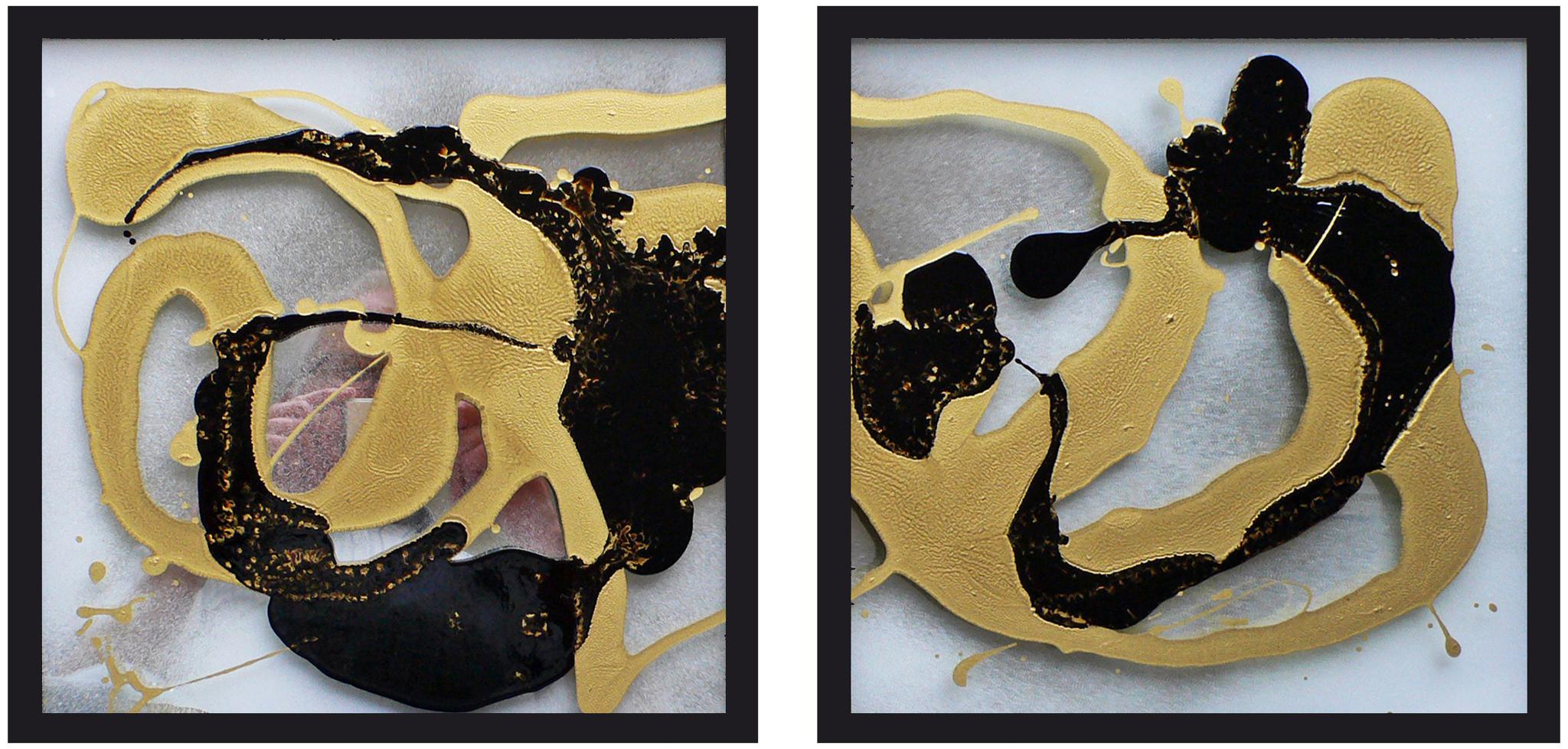 Interpretationsoffene Malerei. Das zweiteilige Gruppenbild besteht aus jeweils zwei Glastafeln (Floatglas). Diese sind in einem Abstand von 5 mm hintereinandergestellt und durch eine schwarze Holzleiste getrennt. Dem Bild wird dadurch eine räumliche Tiefenwirkung verliehen. Hinter der zweiten Glastafel ist ohne Abstand ein Spiegel eingesetzt. Der Abstand der Bilder zueinander ist durch das Foto definiert.