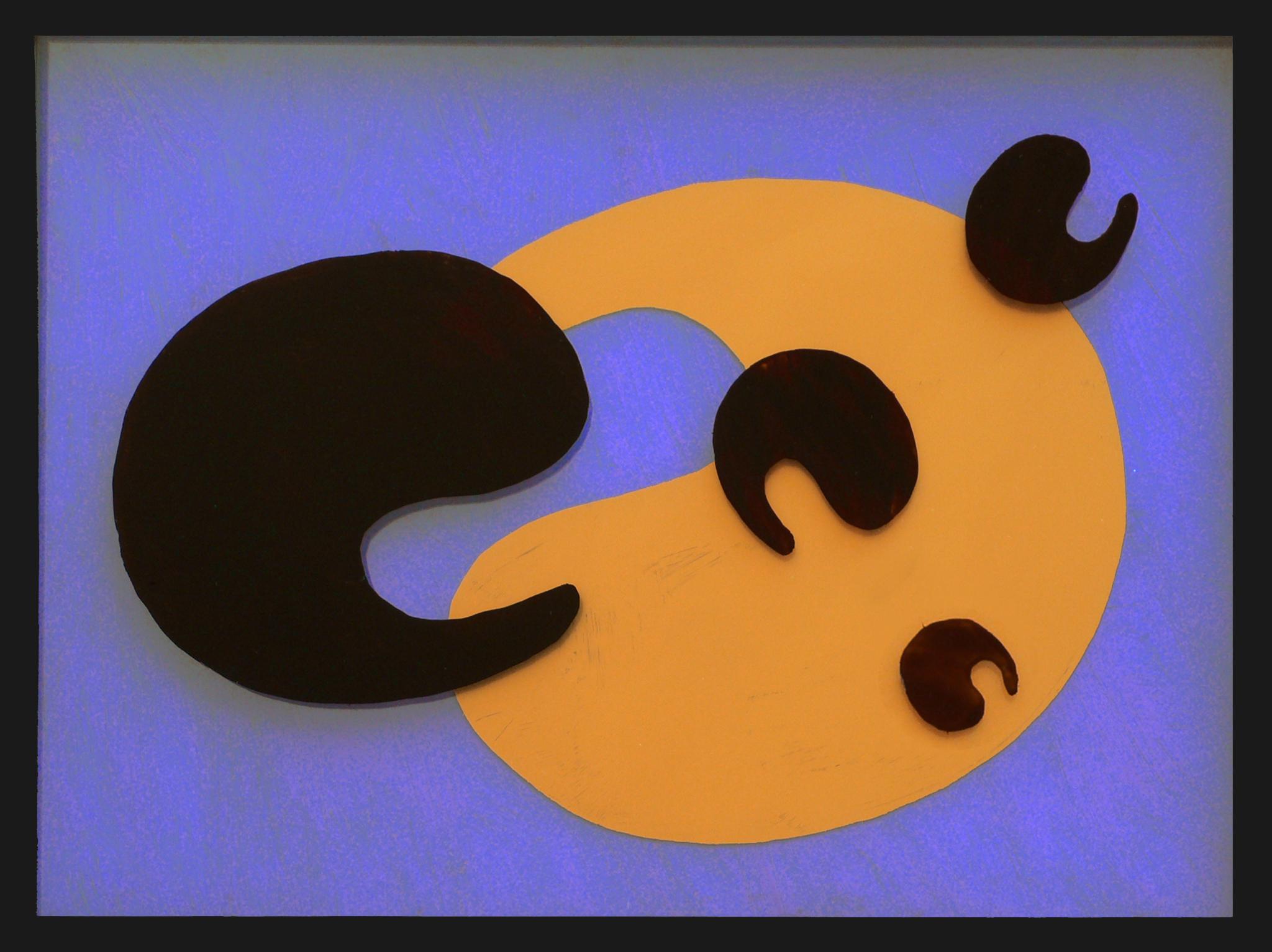 Interpretationsoffene Malerei. Das Hinterglasbild besteht aus zwei Glastafeln (vordere Glastafel thermisch verformtes mundgeblasenes Flachglas, um harte und scharfe Spiegelungen zu vermeiden; hintere Glastafel Floatglas). Diese sind in einem Abstand von 5 mm hintereinandergestellt und durch eine schwarze Holzleiste getrennt. Dem Bild wird dadurch eine räumliche Tiefenwirkung verliehen.