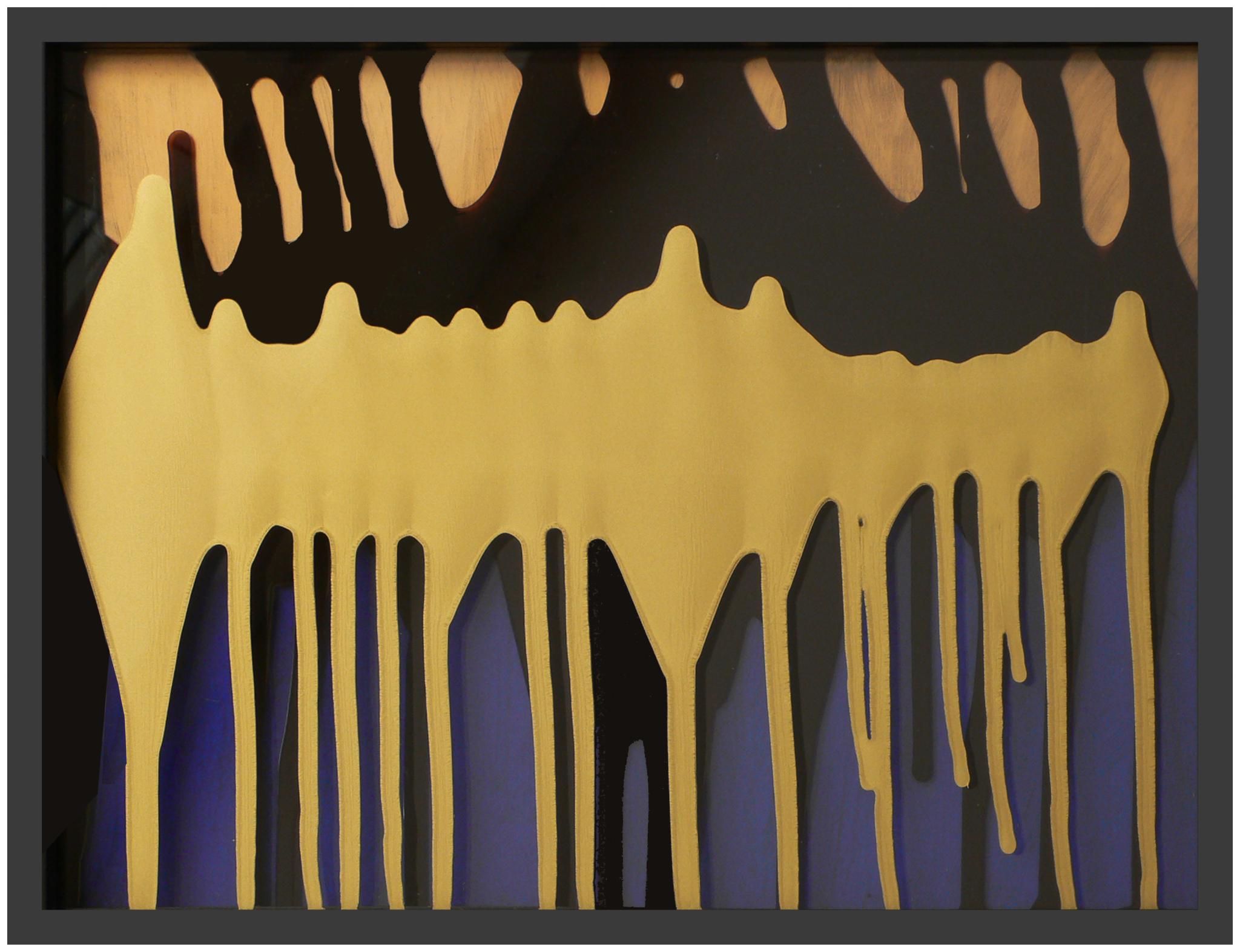 Auf der vorderen Glastafel: aufgegossene flüssige goldene Metallglanzfarbe, vor dem Trocknen durch Bewegen der Glastafel gezielt nach oben und unten verlaufen; auf der Vorderseite der hinteren Glastafel aufgegossener Asphaltlack, vor dem Trocknen durch Bewegen der Glastafel gezielt nach oben und unten verlaufen, im oberen Bereich mit goldener Metallglanzfarbe übermalt; Rückseite der hinteren Glastafel ganzflächig mit violetter Deckfarbe übermalt