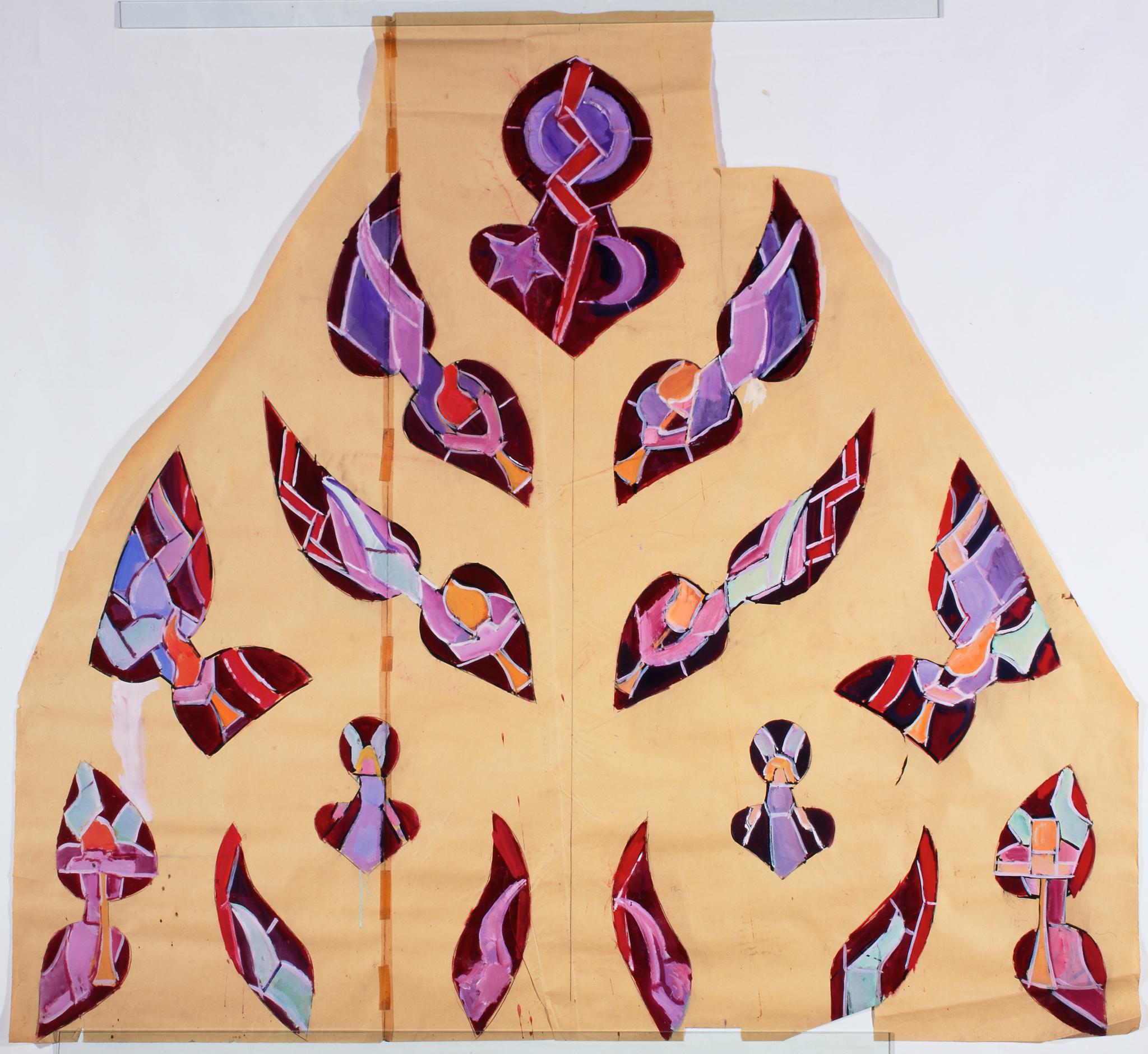 Ce carton illustre la partie supérieure du vitrail consacré au Jugement dernier et présente différents motifs inscrits dans les ajours de réseau du remplage. Alors qu’au sommet le soleil, la lune et une étoile sont représentés dans un ajour, des anges sonneurs de trompette le sont dans les ouvertures de la partie médiane et inférieure et des anges et des oiseaux figurent dans les ajours du bas.