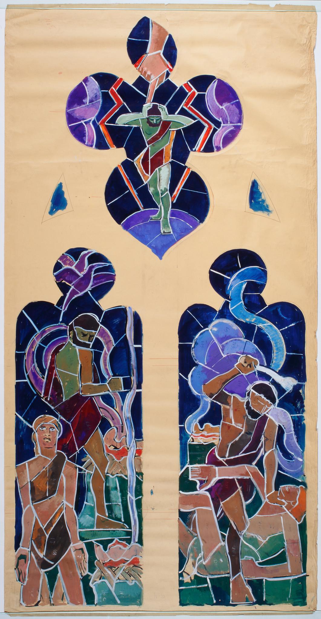 Ce carton en couleur est le dessin précis à l’échelle 1:1 pour la première fenêtre haute à droite dans la nef du temple de Coppet.
