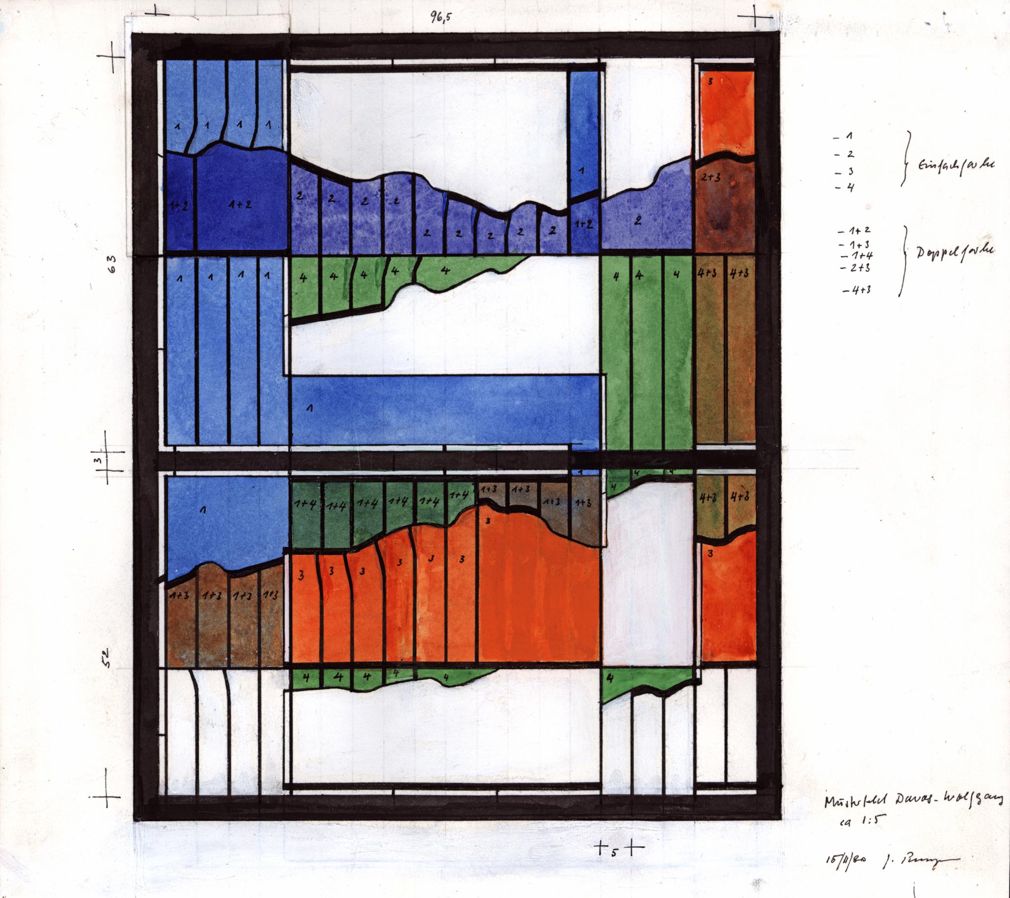 Entwurf im Massstab 1:5 für ein Musterfeld (unterer Teil eines Rundbogenfensters, das in orange-braunen und blau-grünen Tönen eine Berglandschaft evoziert). Die notierten Nummern von 1 bis 4 entsprechen der Glasfarbe. Inschriften auf der rechten Seite (“Einfachfarbe / Doppelfarbe”) präzisieren, ob die Gläser ein- oder doppelfarbig sein werden.