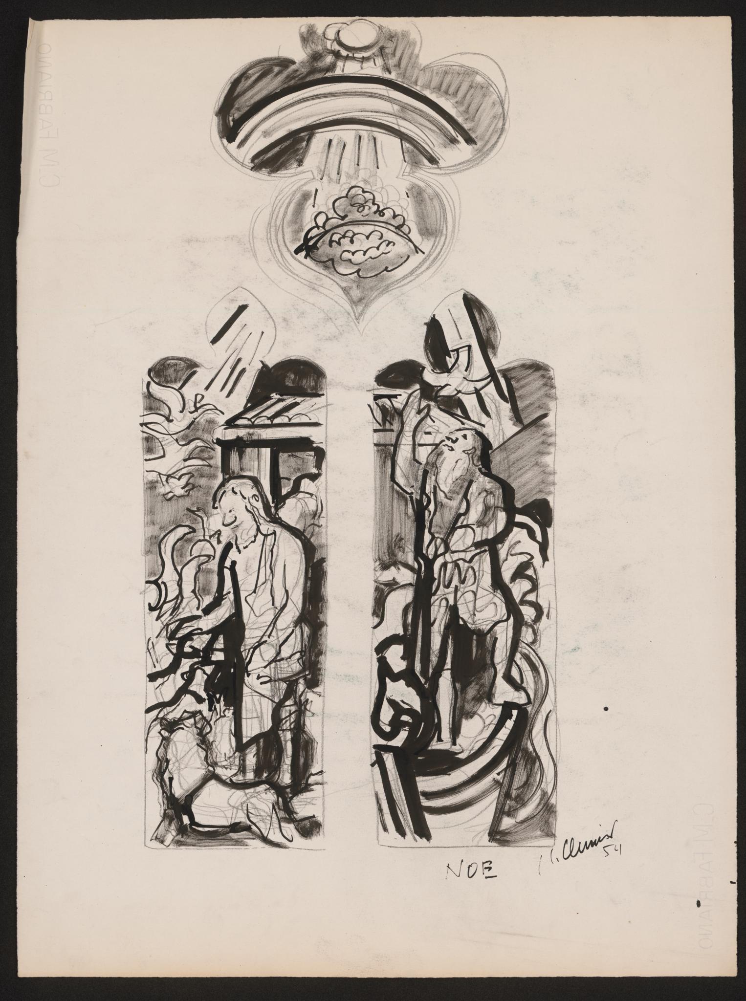 Cette esquisse présente un vitrail à deux lancettes. Sur celle de gauche, Noé est au milieu d'animaux (oiseaux, oies, mouton, lion, chien) qu'il accueille sur l'arche. A droite, Noé, debout sur la proue de l'arche, lève son bras droit pour accueillir la colombe qui est de retour avec une branche d'olivier dans son bec.