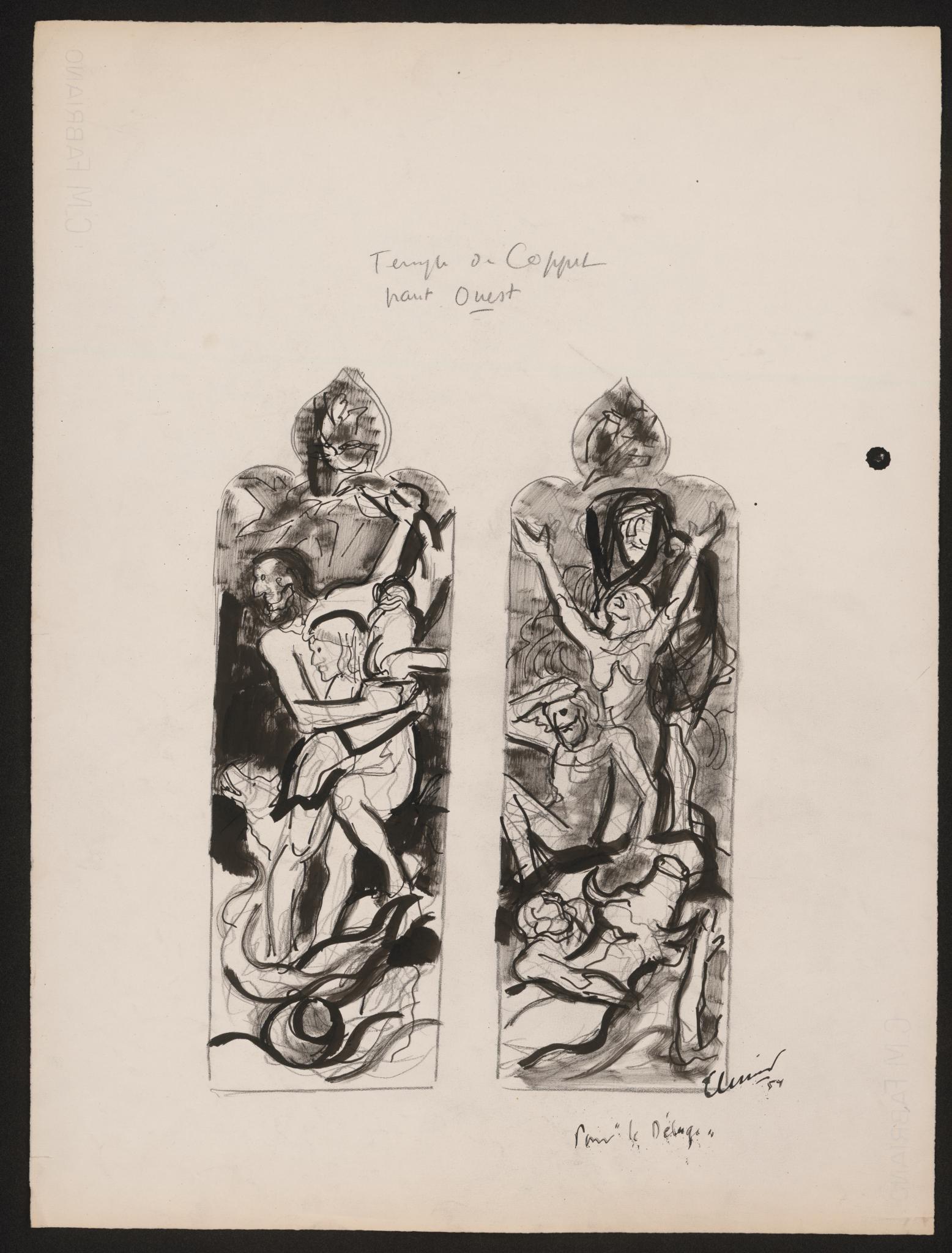 Cette esquisse présente un vitrail à deux lancettes sur le thème du Déluge. Sur celle de gauche, un homme barbu debout retient dans son bras une femme alors qu’elle tient un bébé sur son épaule. A ses pieds à gauche, un chien lève la tête. Au premier plan, une amphore flotte sur l'eau.