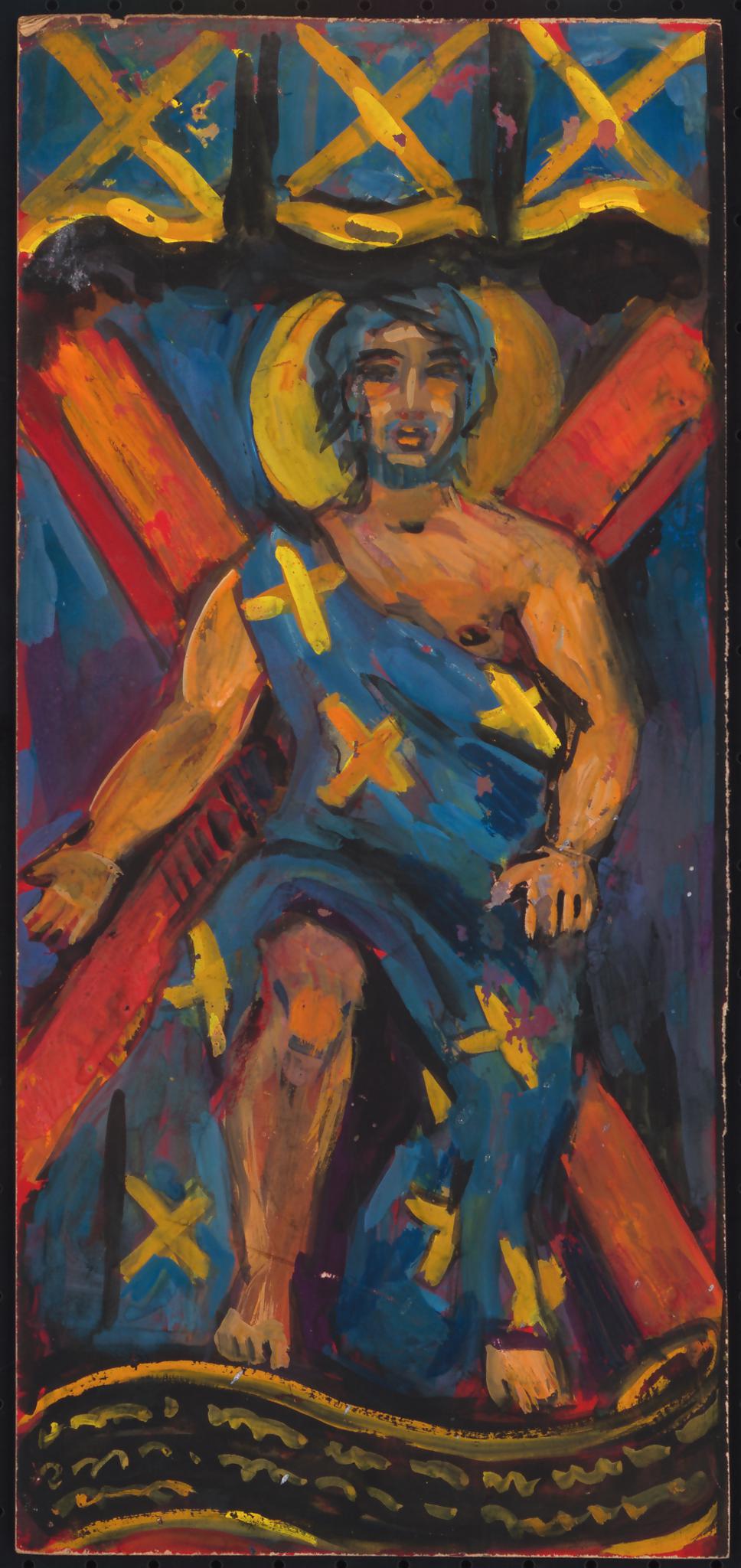 Ce carton réalisé par Alexandre Cingria et représentant saint André correspond à la partie gauche du vitrail commémoratif (VMR_682) réalisé à l’occasion du cinquantième anniversaire de Fernand Dumas, le 4 janvier 1942. Il est composé de trois panneaux assemblés dans une armature métallique.