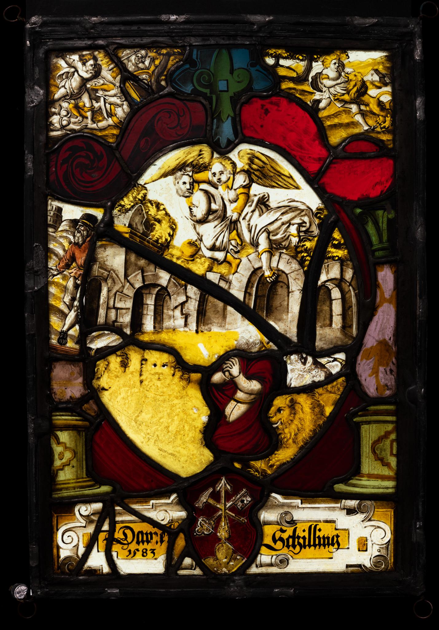 Das ovale Mittelbild zeigt Daniel, den Namenspatron des Stifters. In einen roten Mantel gekleidet, kniet er in der Löwengrube und schaut zum Himmel empor, von wo der Prophet Habakuk, von einem Engel herbeigeführt, ihm Nahrung bringt (Dan 14, 33–35). Die Szene rahmen bzw. rahmten seitlich blassviolette Balustersäulen (die linke davon durch ein Flickstück ersetzt). Über dem roten Rollwerkbogen ist in der oberen rechten Bildecke Simson als Löwenbezwinger (Ri 14, 5f) und in der linken Simson bei der Erschlagung der Philister (Ri 15, 15) festgehalten. Den Scheibenfuss füllen die Rollwerkkartusche mit dem Stifternamen sowie das dieser zentral aufgesetzte Wappen Daniel Schillings.