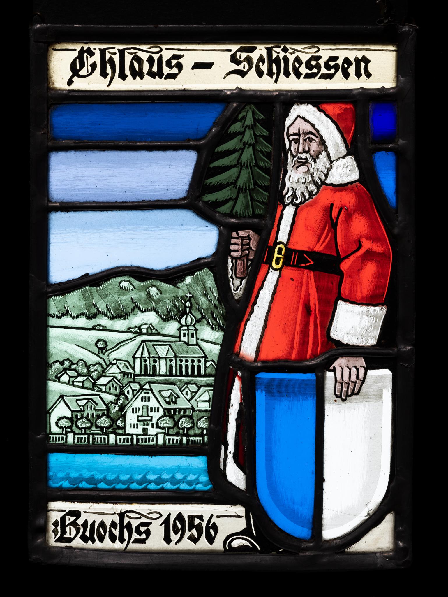 Zur rechten Seite erscheint der Samichlaus als Schildhalter mit dem Wappen von Luzern. In seiner rechten Hand hält er einen Tannenbaum. Neben ihm ist das Städtchen Buochs NW, gelegen am Vierwaldstättersee dargestellt.