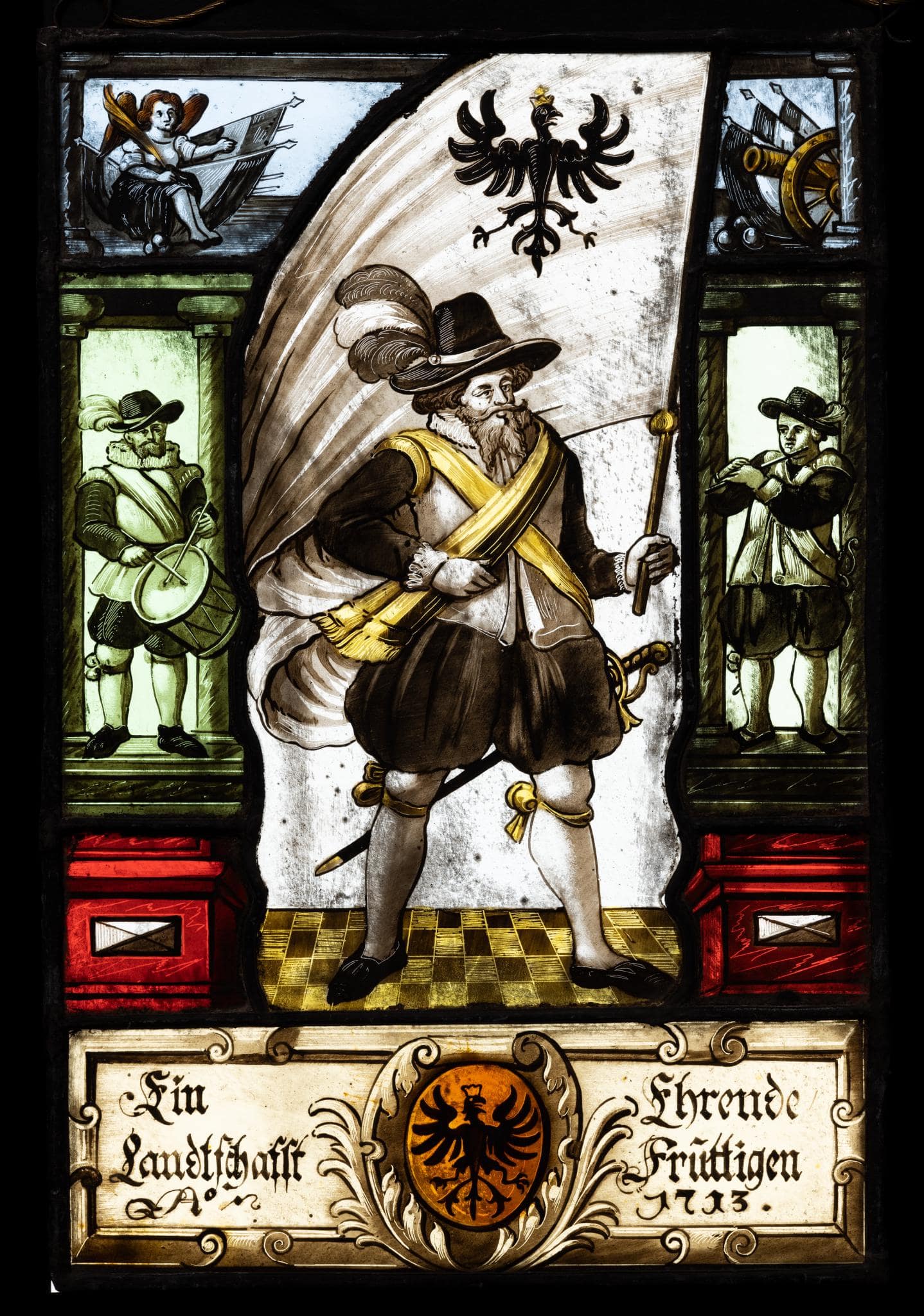 Auf Fliesenboden stehend vor farblosem Grund der Bannerträger der Landschaft Frutigen, darunter in Rollwerkkartusche das Wappen Frutigens auf der hellgelben Inschriftentafel; zu Seiten des Bannerträgers vor hellgrünem Grund auf Postamenten stehend ein Trommler und Pfeifer. Im Oberbild Waffentrophäen (Kanone, Fahnen etc.) mit sitzendem Engel.