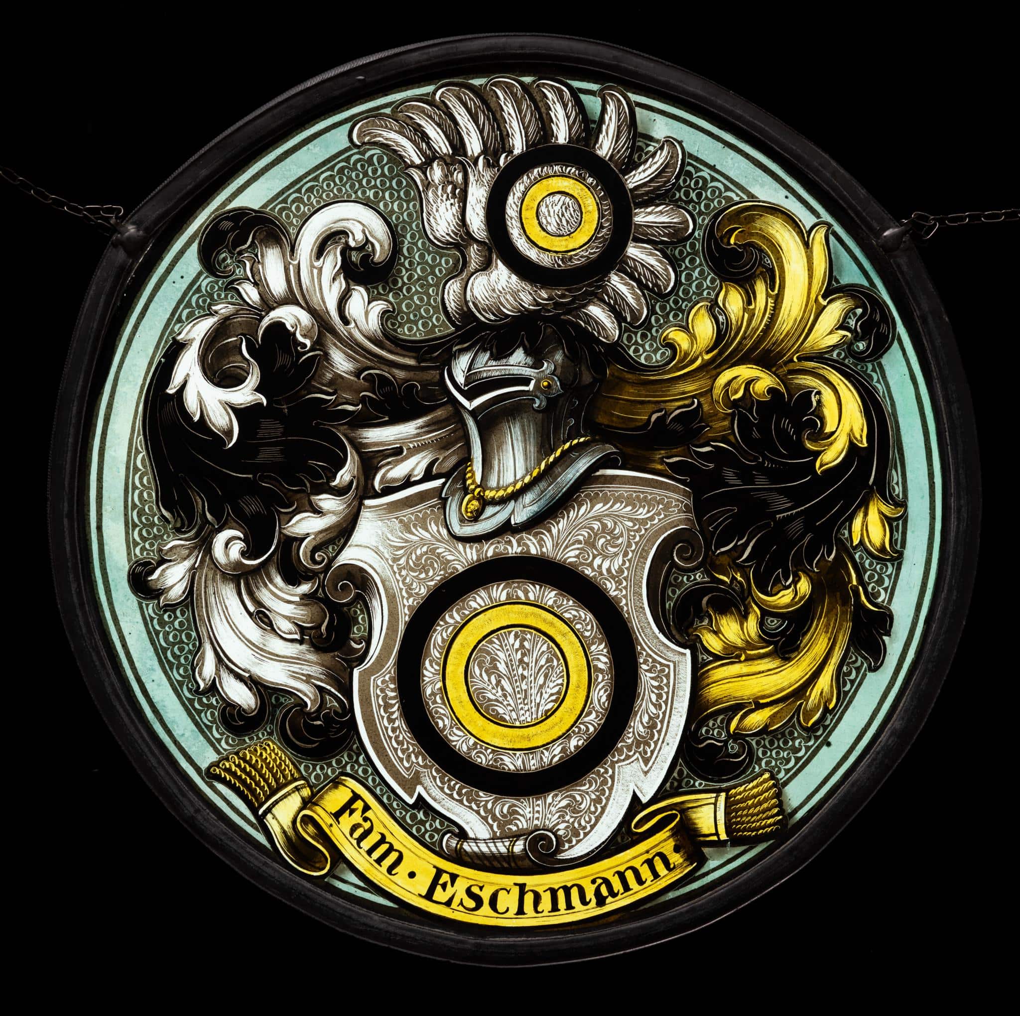 Vor grünem Grund das Vollwappen der Familie Eschmann.