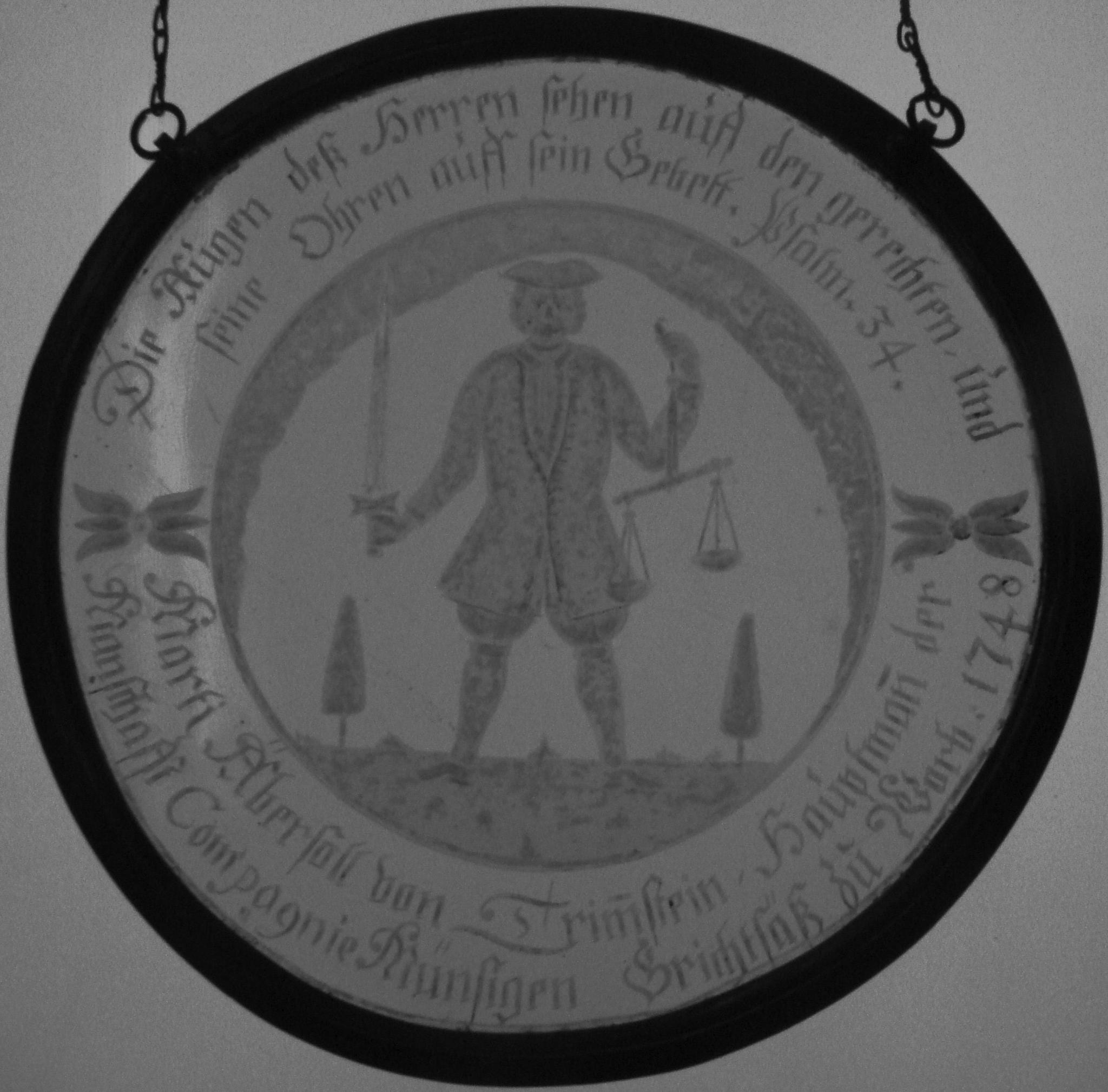 Runde Schliffscheibe mit der Darstellung eines Gerichtsässen im Ornat mit Schwert und Waage in den Händen. Umlaufend Inschrift und Spruch.