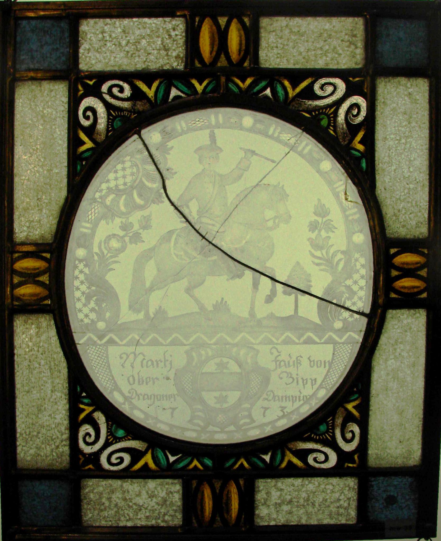 Ovale Schliffscheibe mit Darstellung eines Dragonertambours zu Pferd, umrahmt mit einer Rocaillebordüre. Am Scheibenfuss das Wappen und die Stifterinschrift.