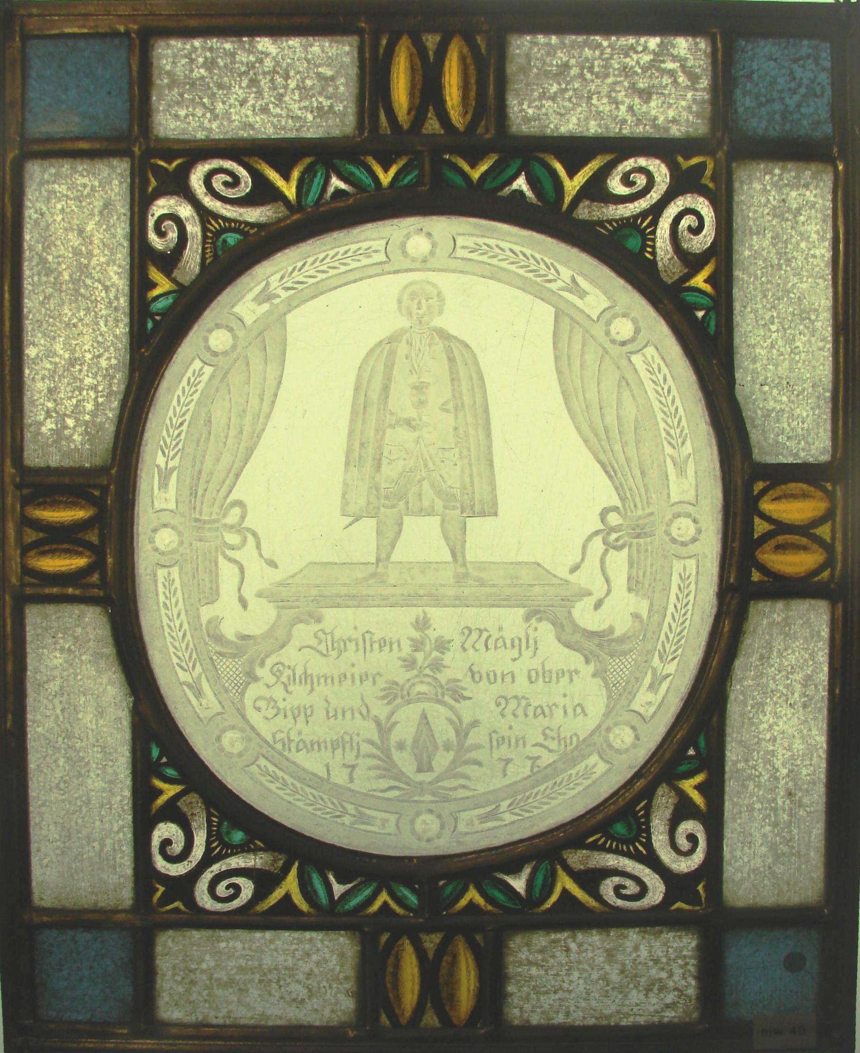 Ovale Schliffscheibe mit der Darstellung eines zwischen zwei Vorhängen auf einem Podest stehenden Kirchmeiers im Ornat, einen Kelch in der Hand haltend. Darunter das Wappen und die Stifterinschrift. Bordüre mit Kugelungen und Blattzweigen.