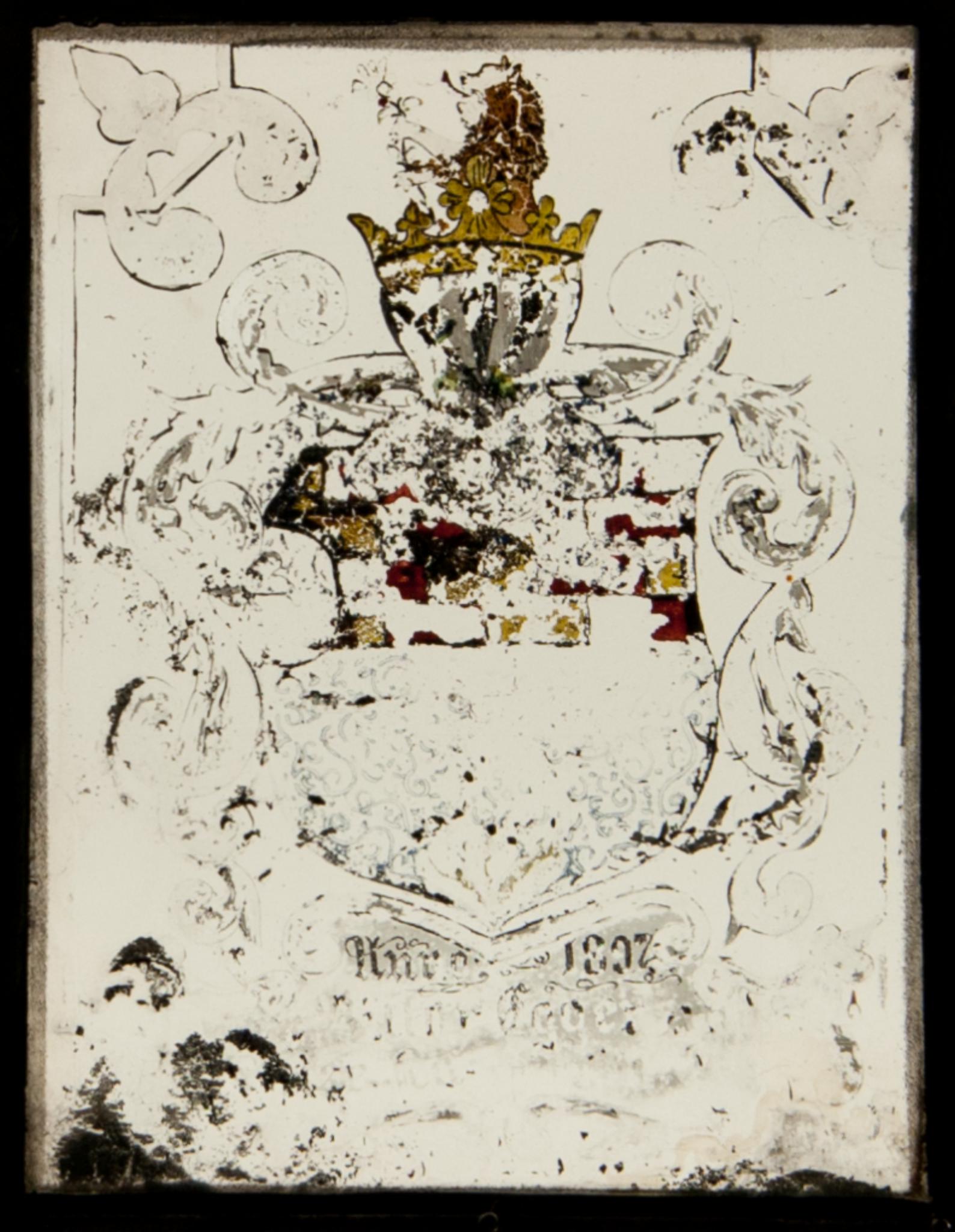 Restaurierung: 2021 Ursula Knoblauch, Bern. Ausbau der alten Wappenscheibe und Anfertigung einer Kopie (siehe Korrespondenz im Vitrocentre Romont).