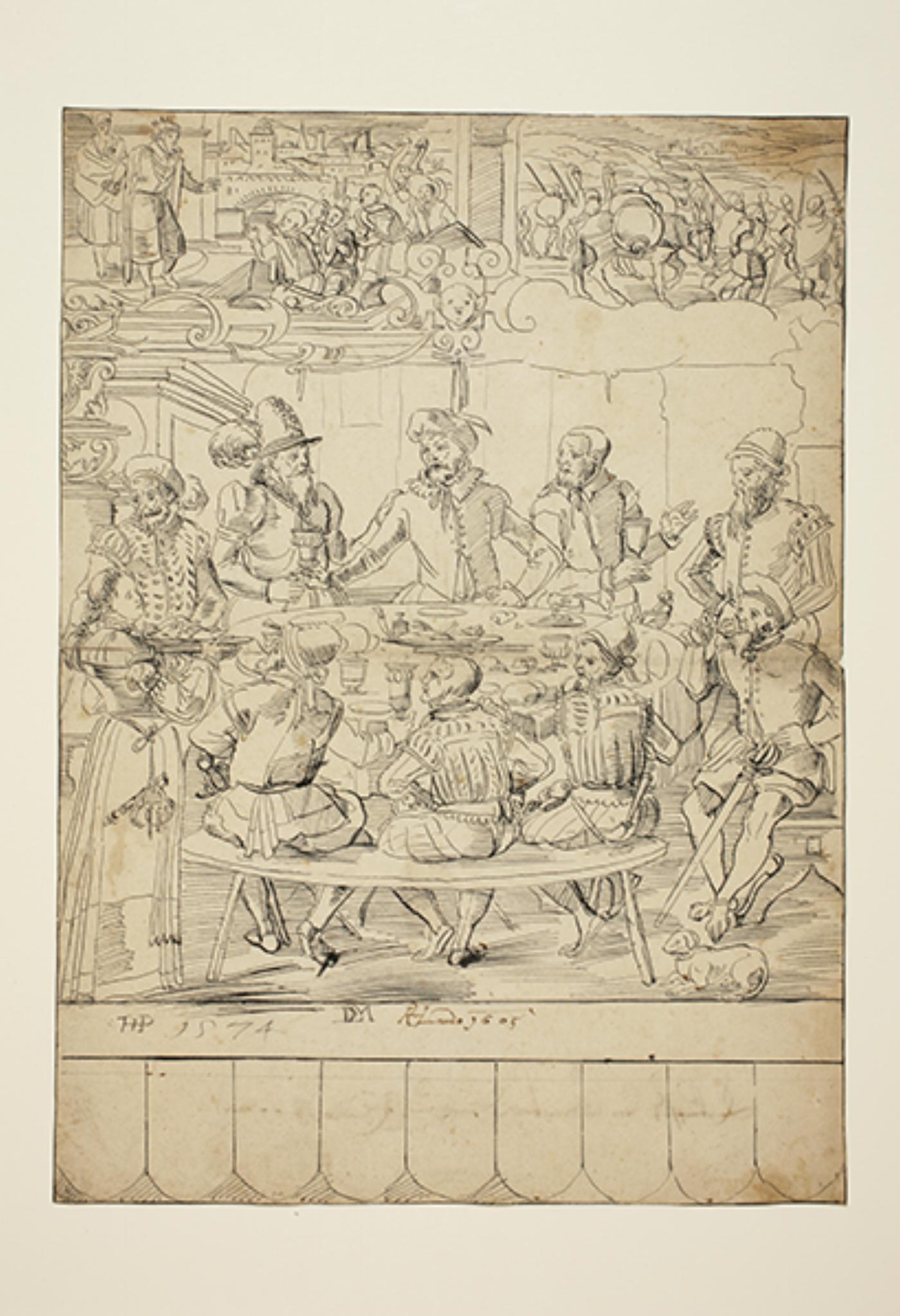 Neun Männer sitzen an einer runden Tafel und werden von einer Frau bedient, die links ein Tablett mit Speisen heranträgt. Die Zunftgesellen, die vorne am Tisch sitzen und dem Betrachter den Rücken zuweisen, richten ihren Blick auf die Frau, wodurch ihre Gesichter sichtbar werden. Die Männer gestikulieren und halten Gläser in den Händen. Unterhalb des Hauptbildes sind neun leere Wappenschilde aneinandergereiht. Die Oberbilder nehmen zwei Szenen aus der Josephsgeschichte auf. Links Joseph beim Empfang seiner Brüder in Ägypten und rechts die Rückkehr der Brüder mit den Waren.
