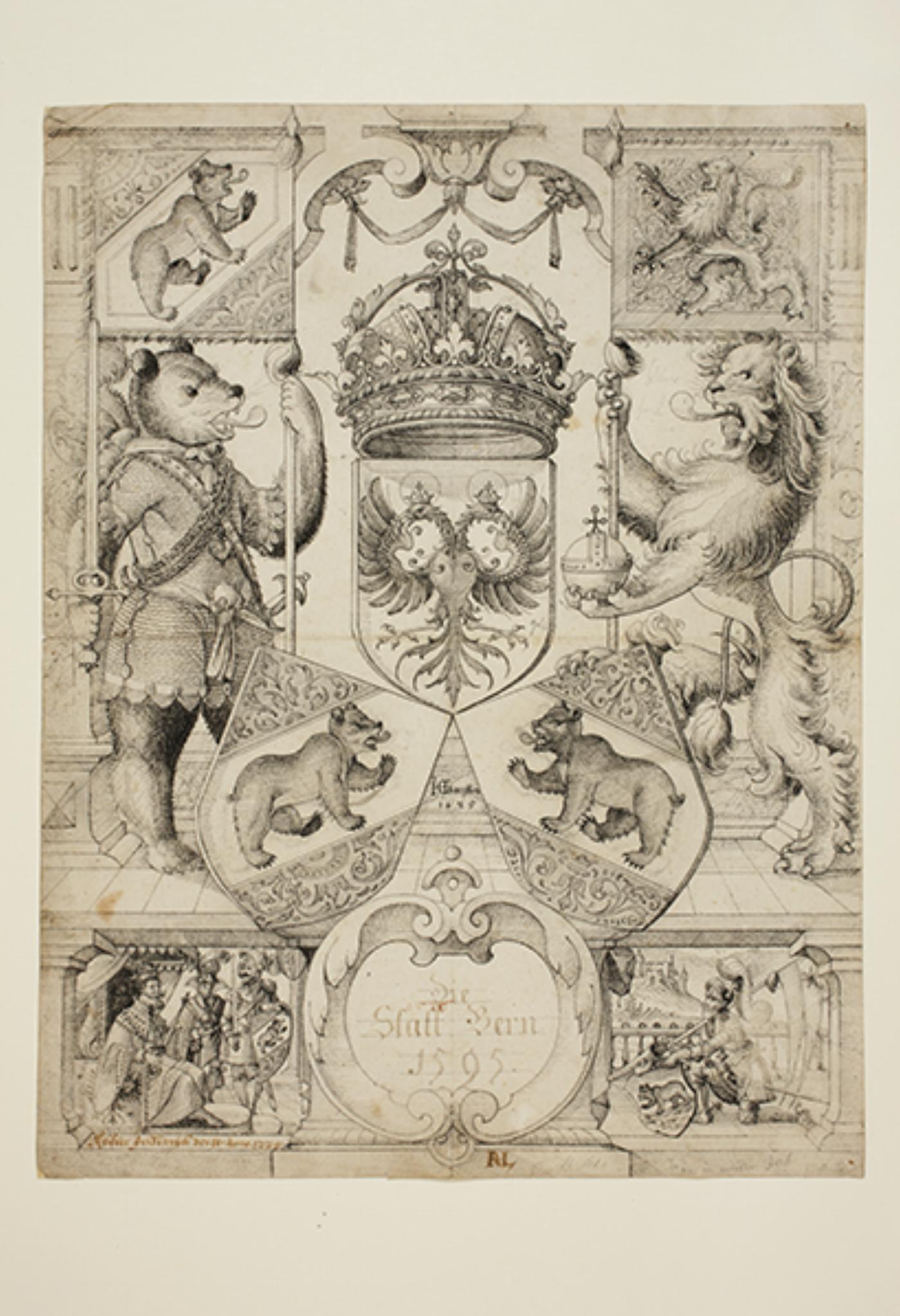 Die Wappenpyramide Bern-Reich wird links von einem Berner Bär mit Banner und Schwert und rechts von einem Zähringer Löwen mit Banner und Reichsapfel begleitet. Über dem Doppeladler-Wappen prangt die Reichskrone. Der Bär trägt über dem Kettenhemd eine Ehrenkette mit einem Bernmedaillon, ein Bandelier mit Schweizerkreuz und zwei Schweizerdolche. Die beiden Schildbegleiter stehen auf einer schmalen Bühne und verdecken mit ihren Bannern Teile der Pilasterarchitektur. Unten schliesst der Entwurf mit einem Sockel ab, der in der Mitte eine Inschriftenkartusche trägt und links und rechts mit zwei figürlichen Szenen ausgefüllt ist. Links thront Kaiser Friedrich II. mit Reichsapfel und Zepter in den Händen unter einem Baldachin. Er empfängt einen Edelmann und einen Ritter mit dem Bernschild. Im rechten Bildfeld kniet ein Ritter in Rüstung vor einer Ballustrade, hinter der sich der Blick auf eine Landschaft öffnet. Er trägt die Fahne der Bubenberg und ein Schild mit dem alten Bern Wappen.