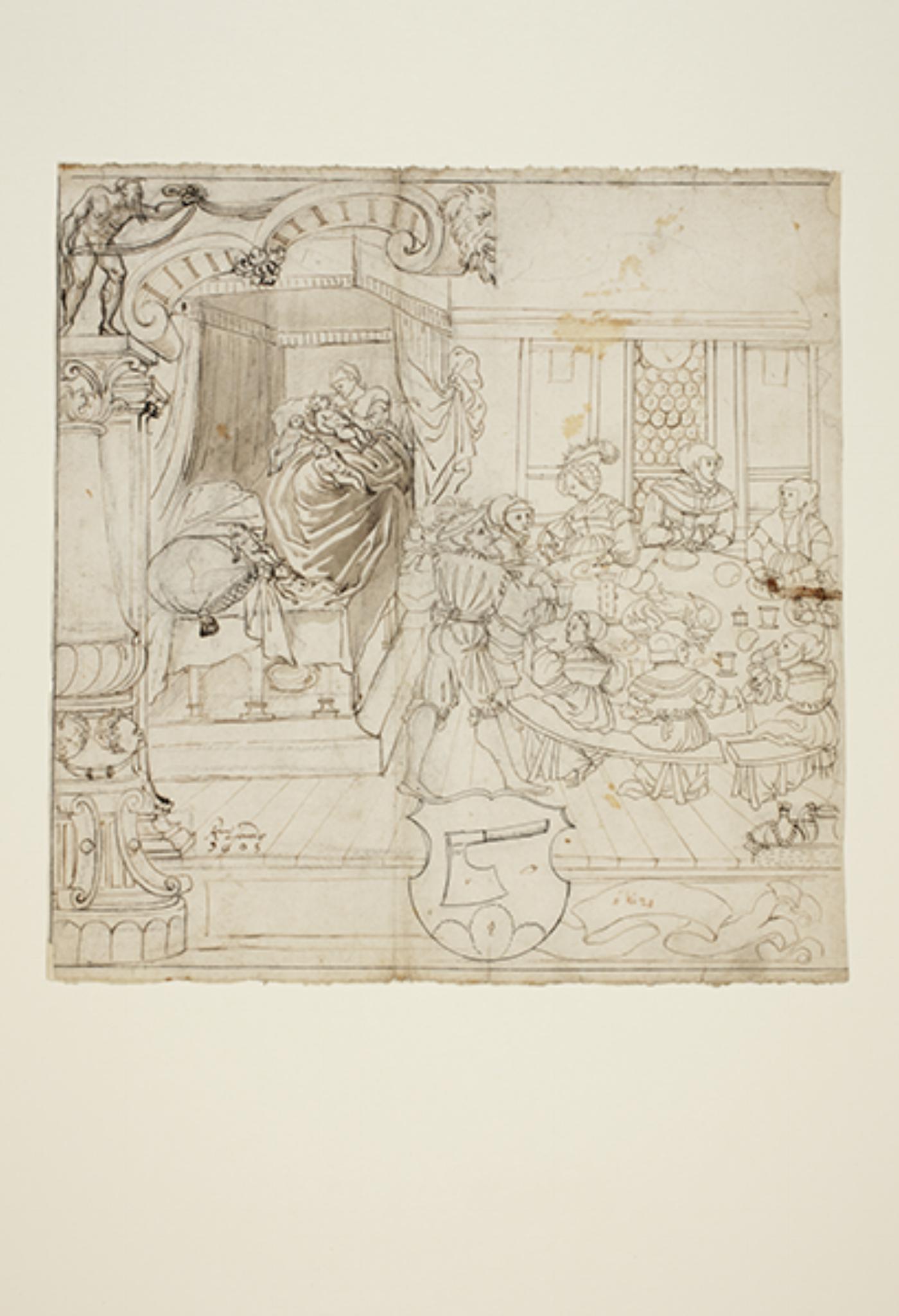 Die Forschung hat die Szene bisher weder identifizieren, noch einer bestimmten Vorlage oder einem Erzählkontext zuweisen können. Die Darstellung erinnert an einen Riss Daniel Lindtmayers, der die Vorlage für eine Taufscheibe gewesen sein dürfte und sich in der Kunstbibliothek in Berlin (Hdz 1576) befindet. Auf diesem ist ebenfalls eine Tafelrunde mit sieben Herren und einem Vater mit Kind dargestellt, sowie einem Schenk in Narrenkleidung (Thöne 1975, Nr. 268). Davon ausgehend könnte nach Hasler (1996/1997, 1. Bd. S. 193) der Entwurf ebenfalls für eine Geburt oder Taufe in Auftrag geben worden sein.