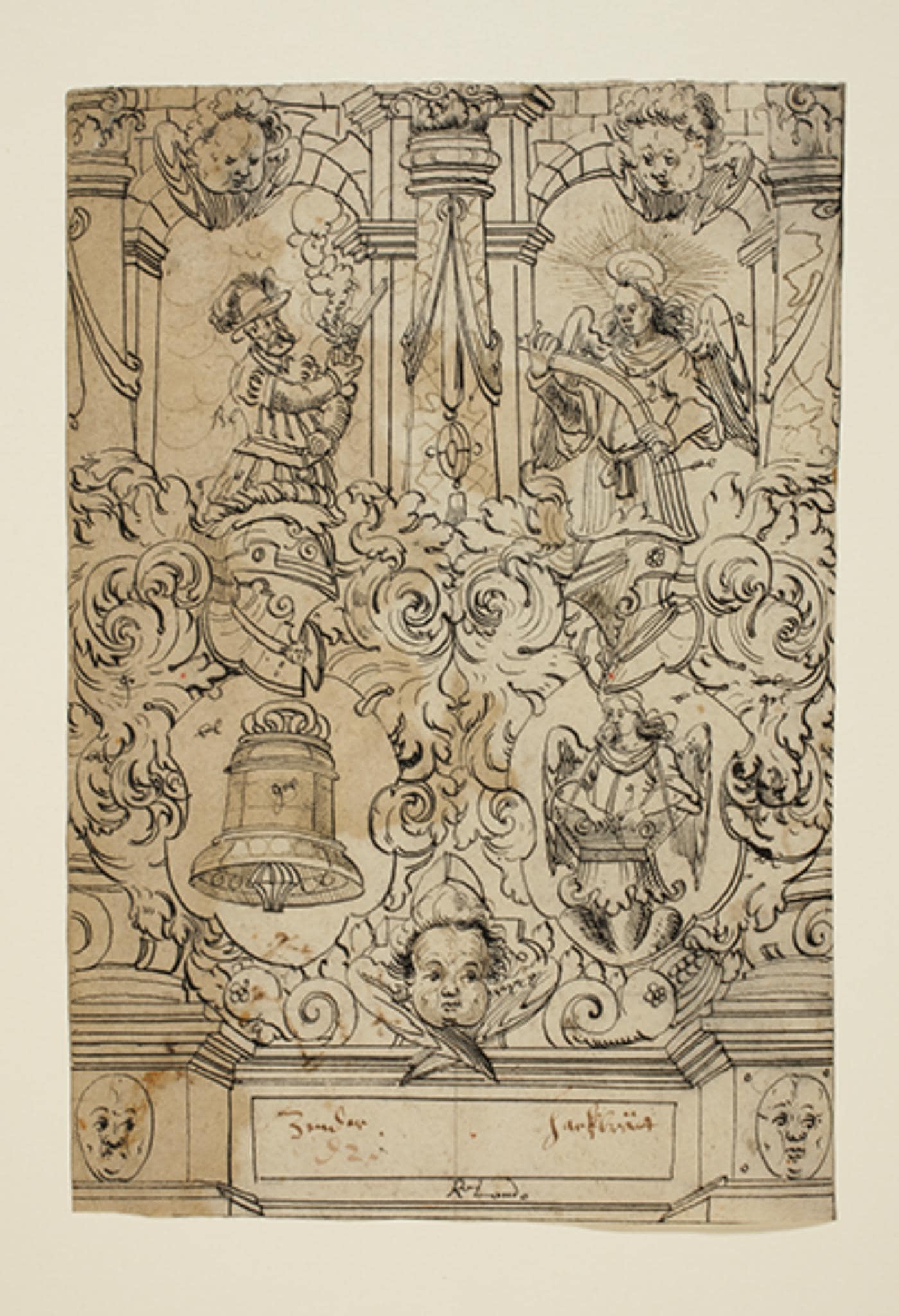 Die Zeichnung ist in dunklen Federstrichen ausgeführt, die teilweise mit helleren feinen Linien schraffiert sind, wie zum Beispiel bei der Glocke des Wappen Zehnders, beim Heiligenschein des Engels der Helmzier rechts oder beim Engelskopf über der Inschriftenkartusche. In dieser sind die Wappen in Hellbraun benannt und darunter steht der Vermerk HRLando. Mit kleinen Buchstaben oder Zeichen sind die Farben gekennzeichnet.