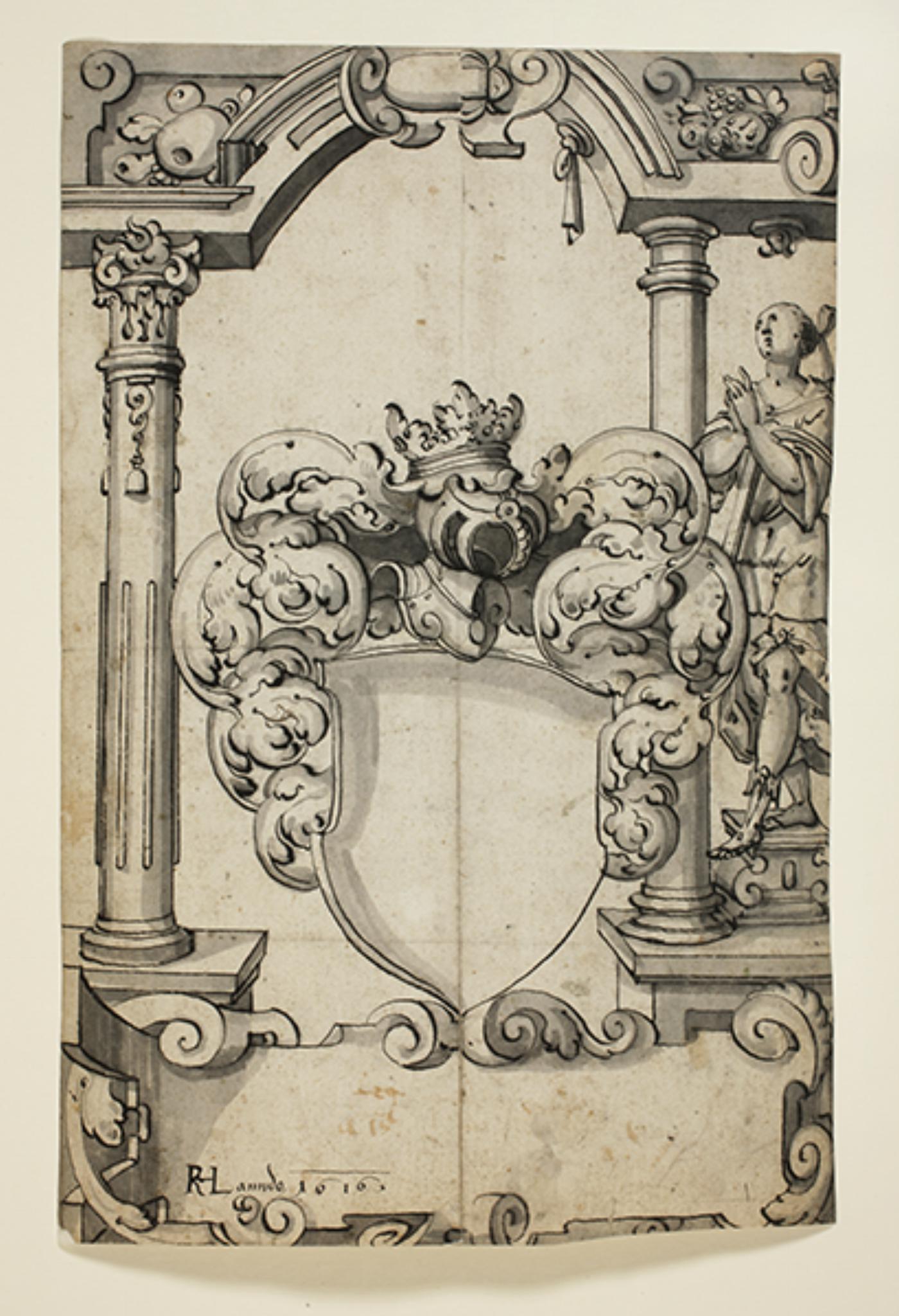 Der leere Wappenschild steht im Zentrum über einer Rollwerkkartusche. Ein Architekturrahmen in Doppelprojektion rahmt das Wappen. Auf der rechten Seite steht eine aufrecht stehende Frauengestalt mit gefalteten Händen. Es dürfte sich wohl um die Personifikation der Spes (Hoffnung) handeln. Die Komposition ist identisch mit einem Riss aus der Sammlung Wyss (BHM. 20036.426, SR_7). Hans Rudolf Lando hat den Besitzervermerk am unteren linken Rand der Kartusche eingefügt.
