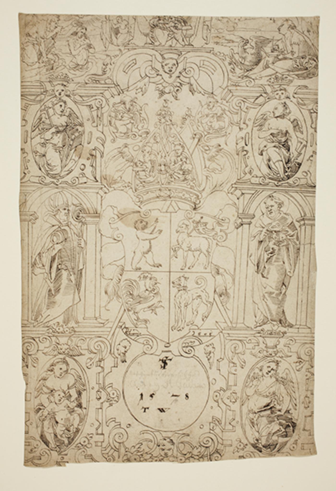 Auf der Kartusche: "ST / 1578 / TW" und in grauem Stift "... / Abtey St. Gallen". Zuseiten des Schildfusses: "HRLando 1605".