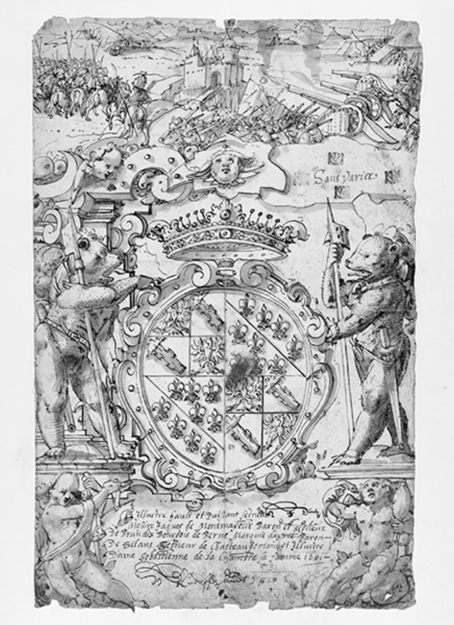 In der Rahmung links: "Sans Varier". Um die Inschrift vier Mal der Stempel "CDV" oder "CBV". In der Kartusche unten: "Illustre hault et puißant segrieur Meßire Jaques de Montmayeur Baron et segrieux de Brandis dix Bourgois de Berne Marquis deyme Baron De Silans Segneur de Chasteau domaine et et Illustre Dame Sebastienne de la Chambre sa famme 1601". In der Kartusche unterhalb des Wappens in dunkler Tinte: HJDüntz 1601". Am unteren Rand: "HRudolff Lando 1605".