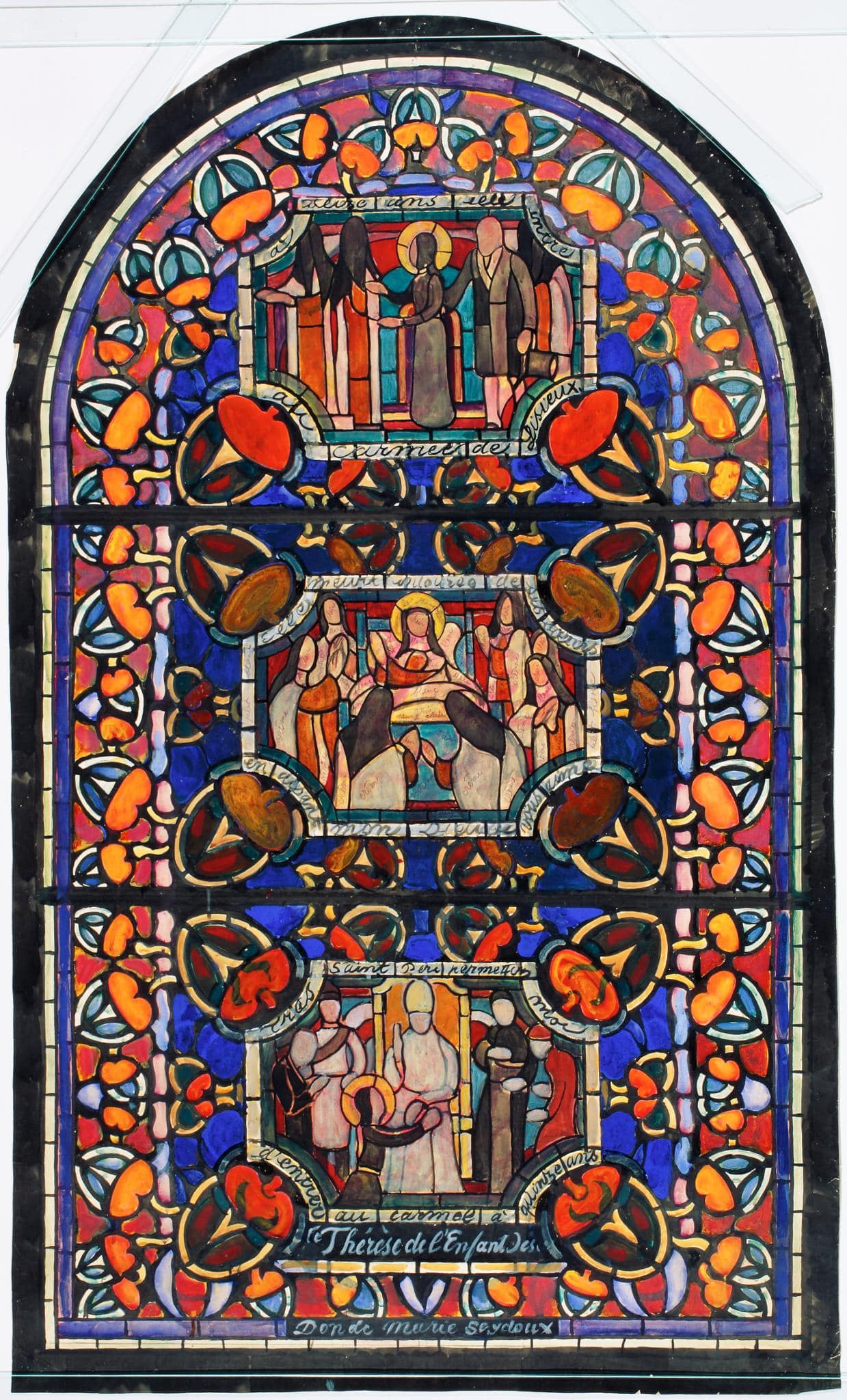 Ce carton illustre trois scènes superposées relatant différents épisodes de la vie de sainte Thérèse de Lisieux.