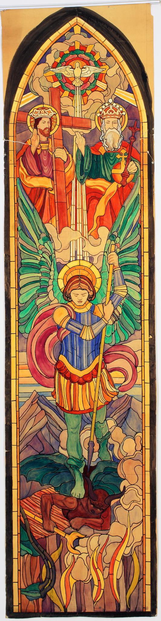 Carton pour une verrière en arc brisé représentant au centre l’archange Michel, les ailes déployées, brandissant de ses deux mains une lance qu’il s’apprête à planter dans le corps du démon, couché au sol, qu’il retient de son pied droit. Celui-ci, tenant une fourche dans sa main droite, essaie de se relever. Au premier plan, des flammes et de la fumée se dégagent de fissures entre les rochers, tandis que l'arrière-plan est composé d'un paysage de montagne.