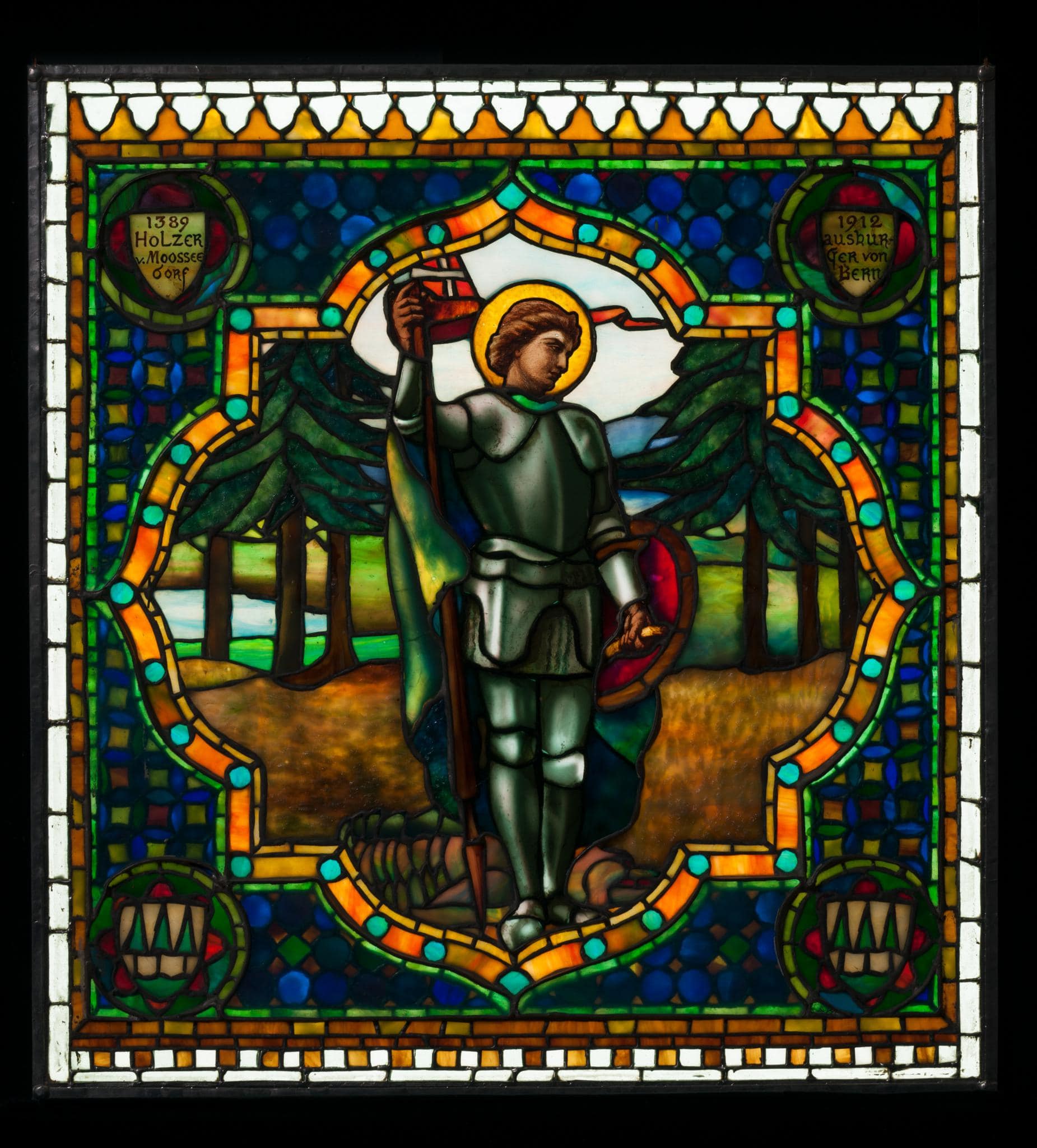 Der in triumphaler Haltung wiedergegebene Heilige Georg mit dem getöteten Drachen zu seinen Füssen erinnert an eidgenössische Wappenscheiben und verweist auf Holzers Familiengeschichte (Wappen). Die technische Umsetzung lässt ein Nebeneinander von Tradition und Innovation erkennen, bei der neben Schwarzlot, Silbergelb und Schmelzfarben auch geschichtetes Opaleszentglas verwendet wurde, das den neusten amerikanischen Trends folgt.