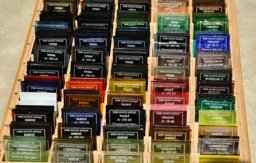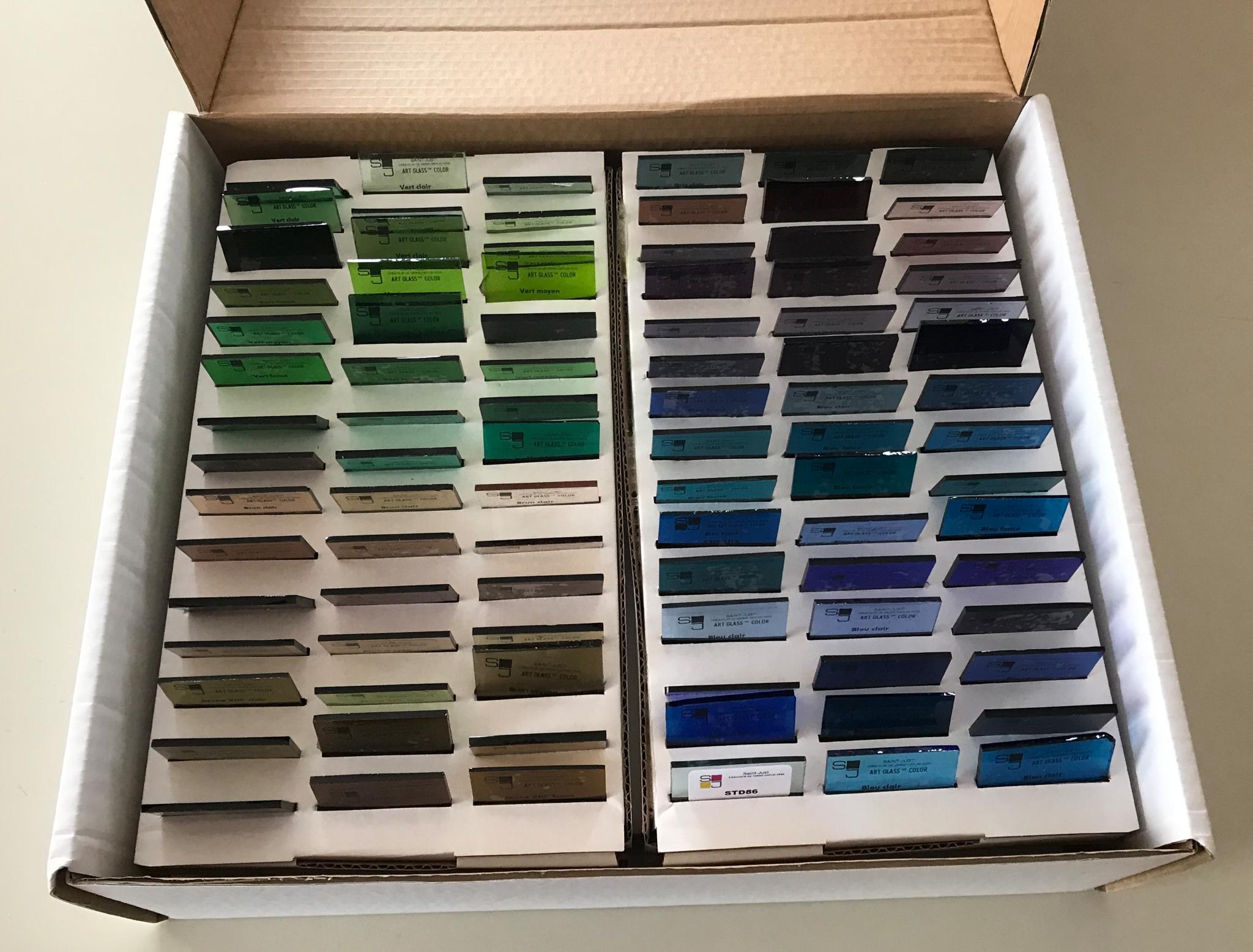 Sur chaque échantillon se trouve un autocollant transparent avec le logo de la verrerie de Saint-Just, le nom de la couleur et le numéro de référence correspondant.