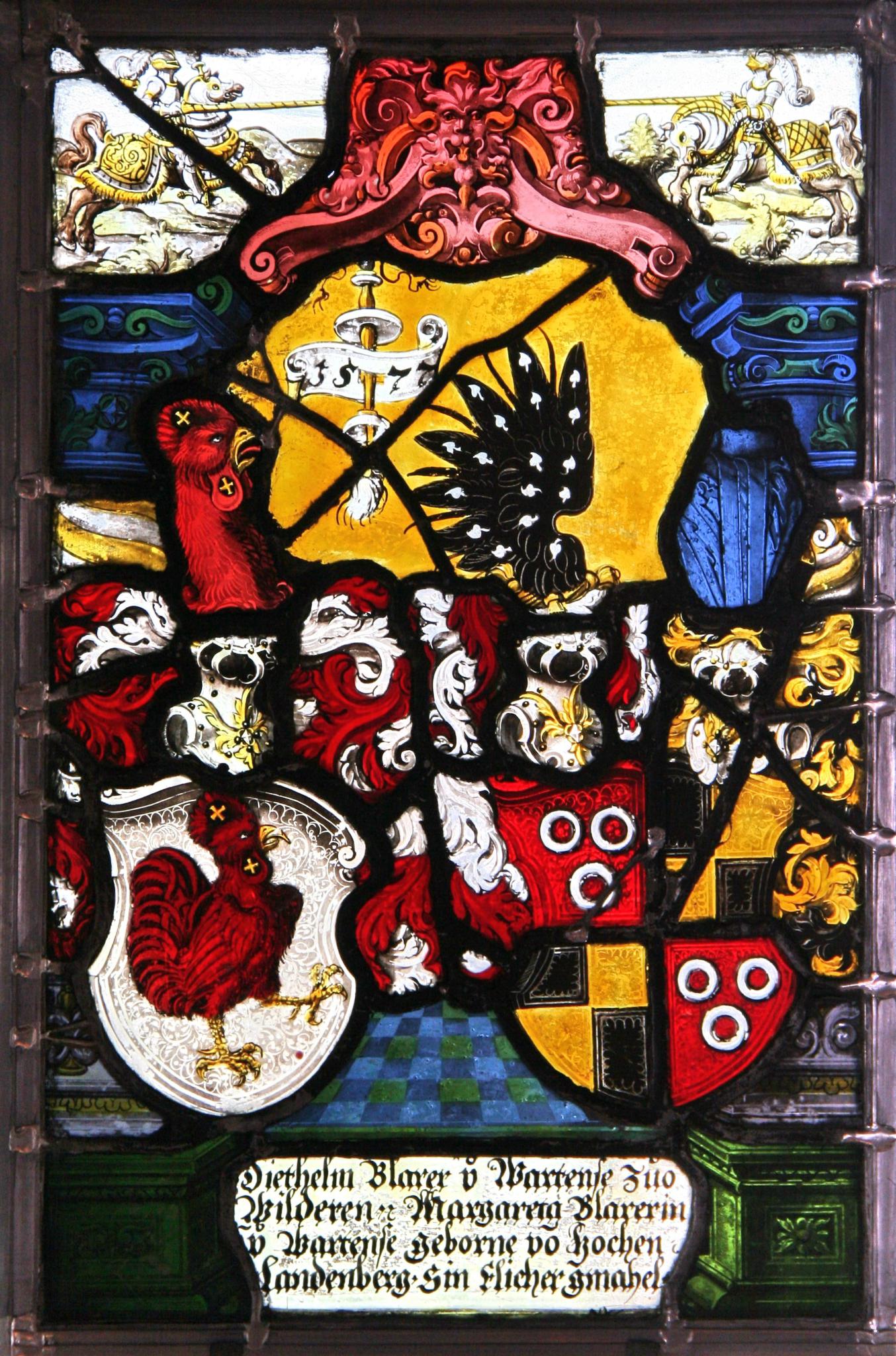 Wappen Blarer von Wartensee, Diethelm: In Silber ein schreitender, golden bewehrter roter Hahn mit zwei goldenen Kreuzen an Kamm und Halslappen; Helm: silbern; Helmdecke: rot und silbern; Helmzier: ein roter Hahnenhals mit zwei goldenen Kreuzen an Kamm und Halslappen.Wappen Hohenlandenberg, Margaretha von: Geviert, 1 und 4 in Rot drei (2, 1) silberne Ringe (Altlandenberg); 2 und 3 geviert von Schwarz und Gold (Landenberg-Greifensee); Helm rechts: silbern; Helmdecke: silbern und rot; Helmzier: über goldenem Zottelband ein geschlossener schwarzer Flug mit silbernen Blättchen; Helm links: silbern; Helmdecke: schwarz und golden; Helmzier: fehlend (Flickstück).