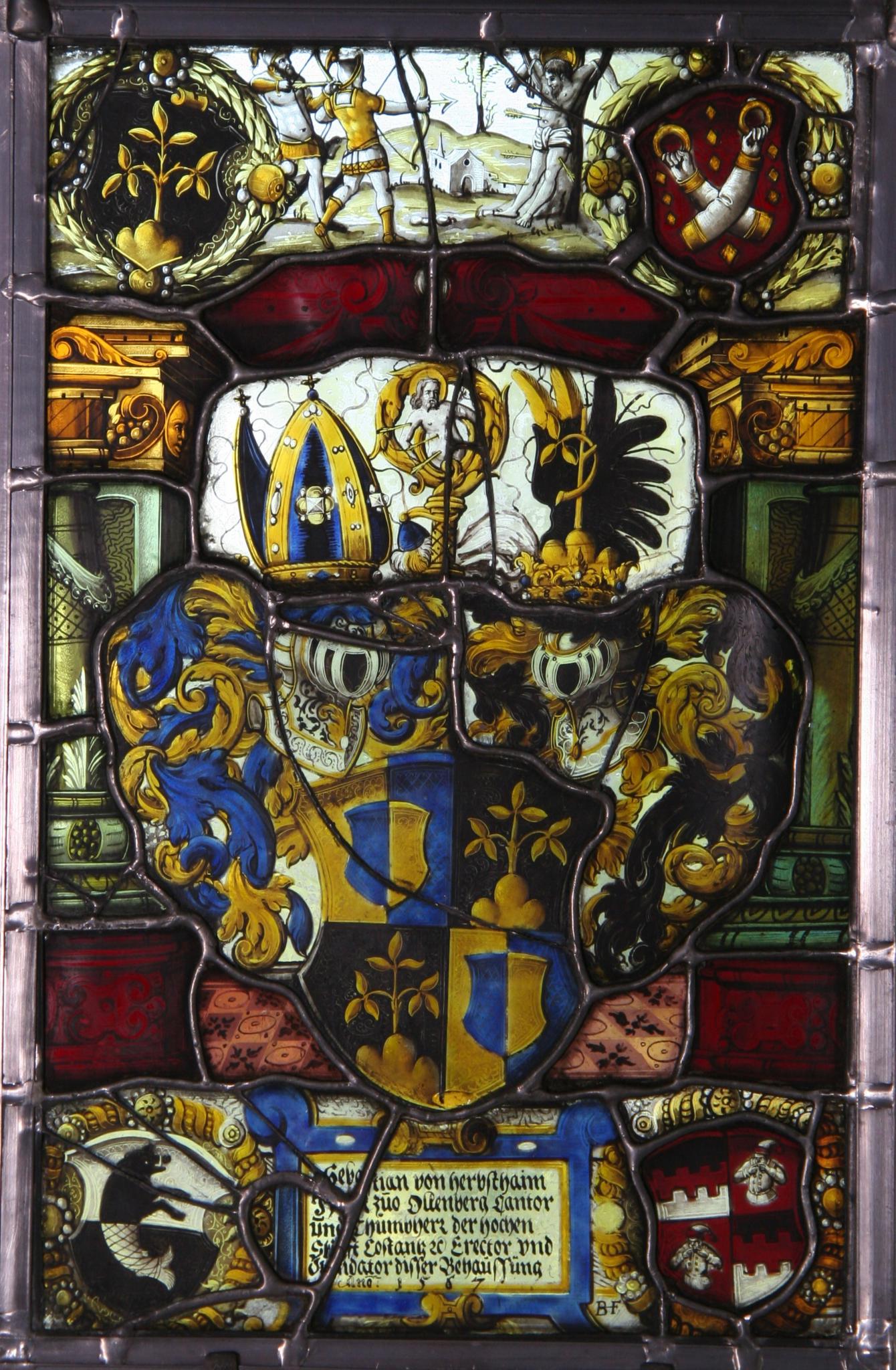 Wappen Herbstheim, Sebastian von: Geviert, 1 und 4 gespalten von Gold und Blau mit einem Schild in gewechselten Farben, 2 und 3 in Schwarz auf goldenem Dreiberg ein goldener Strauch mit drei dreiblättrigen Zweigen; Helm rechts: silbern; Helmdecke: golden und blau; Helmzier: eine blaue goldgeränderte Mitra, Helm links: silbern; Helmdecke: golden und schwarz; Helmzier: über goldener Krone ein geschlossener schwarzer Flug mit zwei goldenen Federn, belegt mit goldenem Strauchstiel auf goldenem Dreiberg und aufgesetztem goldenem Zweig; zwischen beiden Helmen goldenes Pedum mit Halbfigur des hl. Sebastian und silbernem Panisellus.