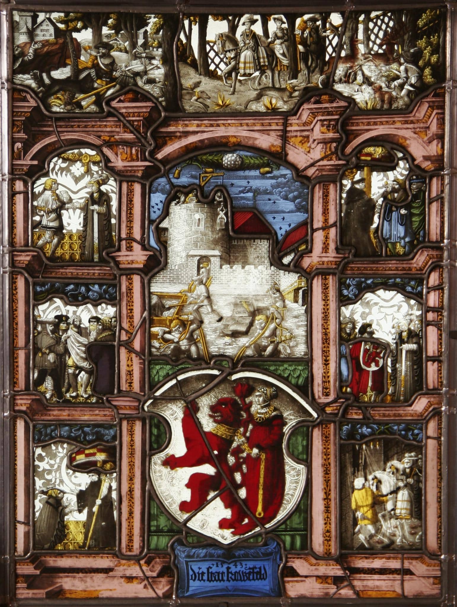 Die Gründungssage von Frauenfeld hielt 1548 Johannes Stumpf in seiner Chronik fest (5. Buch, Kap. XXVII, S. 98; vgl. Leisi, S. 28–29). Demnach wollte sich eine Gräfin von Kyburg (oder von Winterthur) mit einem Ritter von Seen vermählen. Das war jedoch gegen den Willen ihrer Verwandten (“ire freund und erben nit für gut haben”). Deswegen gab die Gräfin Stadt und Burg Frauenfeld dem Abt von Reichenau, um dessen Unterstützung zu erhalten. Dieser gab ihr die Burg wieder als Lehen zurück. Die Frau nahm so den kyburgischen Löwen, also ihre Familie, an die Kette, wie dies im Frauenfelder Wappen dargestellt ist. Die älteste bildliche Darstellung der Legende erscheint auf vorliegender Scheibe. Sie ist ebenfalls auf der Stadtscheibe von 1553 aus Wellhausen (Historisches Museum Thurgau, TG_26) und auf derjenigen von 1567 aus Winterthur (Rathaus Frauenfeld, TG_76) abgebildet.