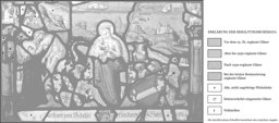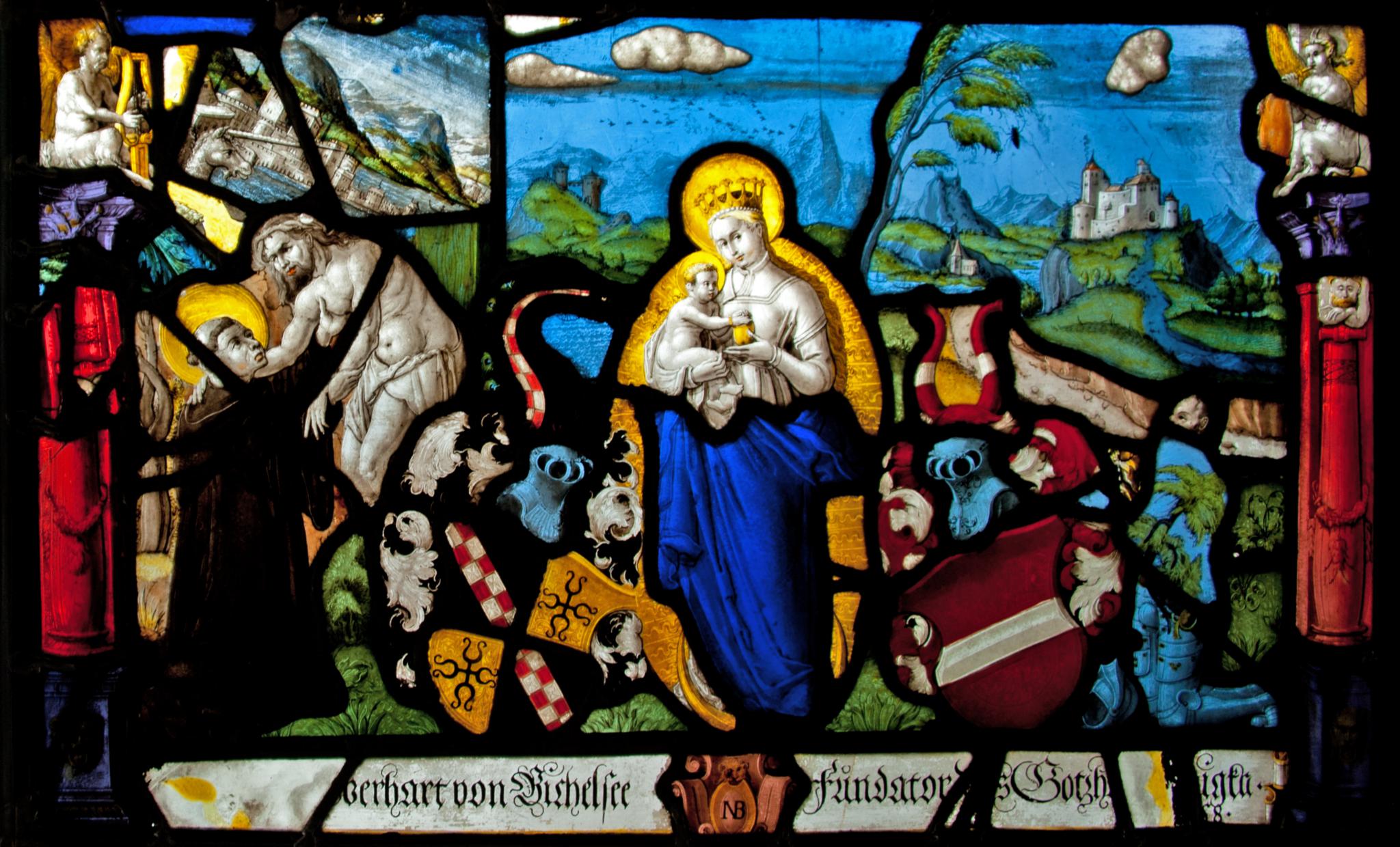 In der Mitte erscheint die Strahlenkranzmadonna in weisser Kleidung und blauem Mantel mit dem Jesusknaben. Zu ihren Seiten befinden sich links der Schild mit dem gevierten Wappen von Kappel sowie rechts dasjenige von Bichelsee. Neben den Wappenschilden knien links der hl. Bernhard, dem sich Christus vom Kreuz entgegenbeugt, um ihn zu umarmen (sog. Amplexus), und rechts der Klostergründer Eberhard von Bichelsee. Am unteren Rand entrollt sich ein Schriftband, dem in der Mitte eine Kartusche mit dem Monogramm Niklaus Bluntschlis aufgesetzt ist. Seitlich begrenzen zwei Pfeiler mit vorgestellten Halbsäulen die Scheibe. Darauf sitzt je ein musizierendes Fabelwesen mit Flügeln und Bocksfüssen. Im Hintergrund ist eine Landschaft mit Alpenpanorama dargestellt. Das Hauptmotiv bildet darin die wohl auf die Burg Bichelsee anspielende Hügelfestung mit der daneben in Trompe-l'œil-Manier festgehaltenen Fliege.