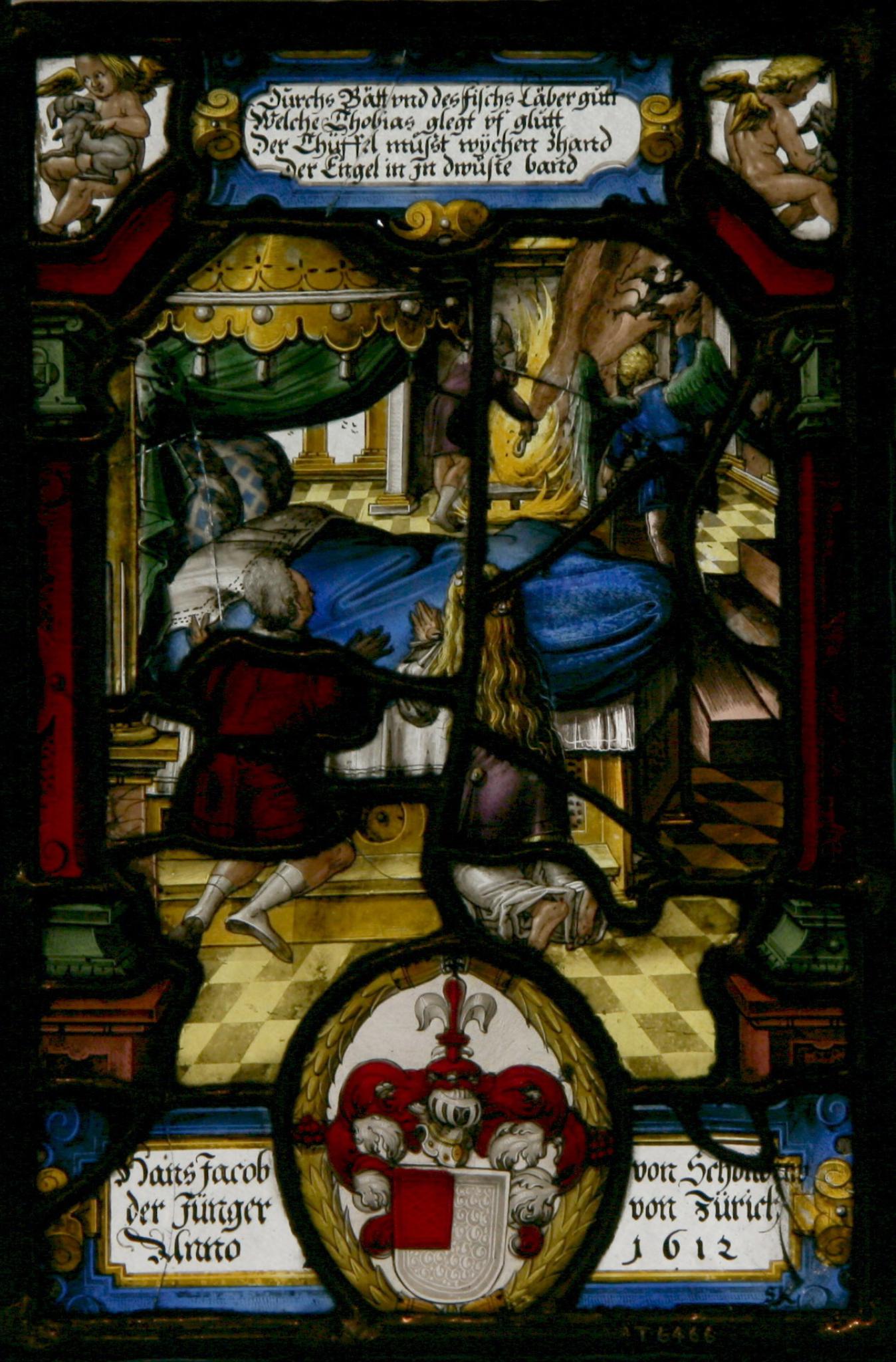 Durchs Bätt und des fischs Läber gůtt / Welche Thobias glegt uf glůtt / Der Thüffel muβt wÿchen zhand / der Engel in Jn dwüste band