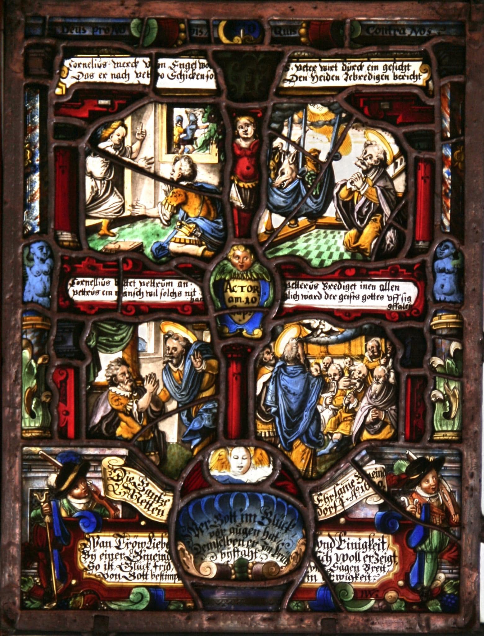 Cornelius merck v[o]m Engel wo[l] / Das er nach Pet[r]o schicken so[l] // S. Peter wirt durch ein gesicht / Den heiden zebredigen bericht // Cornellius b[e]ttet pettrum an / pettrus ein mänsch wil solchs nit / han // petterus Brediget inen allen / glich ward der geists gottes vff sig / gffalen // ACTOR / am. 10 Cap: