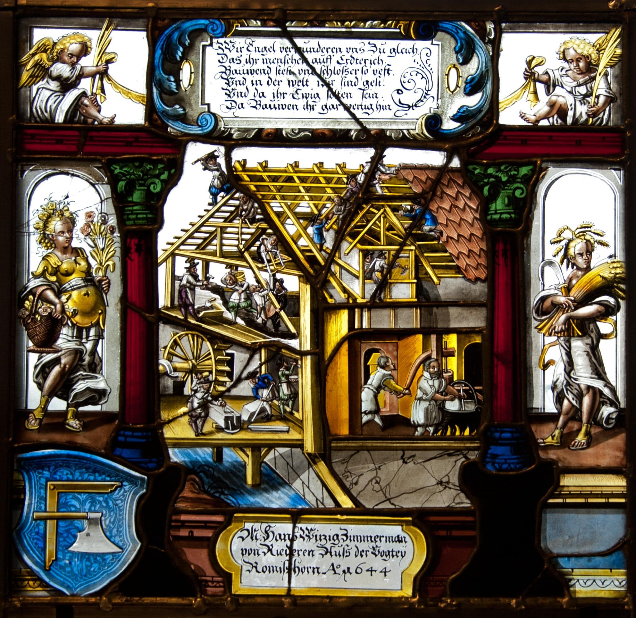 Laut der Stifterinschrift stammte der Zimmermann Hans Witzig aus Riedern in der Vogtei Romanshorn (heute ein Weiler in der Gemeinde Romanshorn). Die Mühle von Riedern wird erstmals 1504 erwähnt (Nater, 1971, S. 4). Auf der Scheibe wird der Zimmermann bei der Ausführung seines Berufs, dem Bau einer Mühle, gezeigt. Der beigefügte Spruch mahnt daran, nicht nur in der vergänglichen Zeit auf Erden zu bauen, sondern vor allem für die Ewigkeit vorzusorgen.