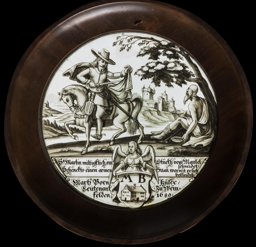 Monolithscheibe aus farblosem Glas; Bemalung mit Schwarzlot.