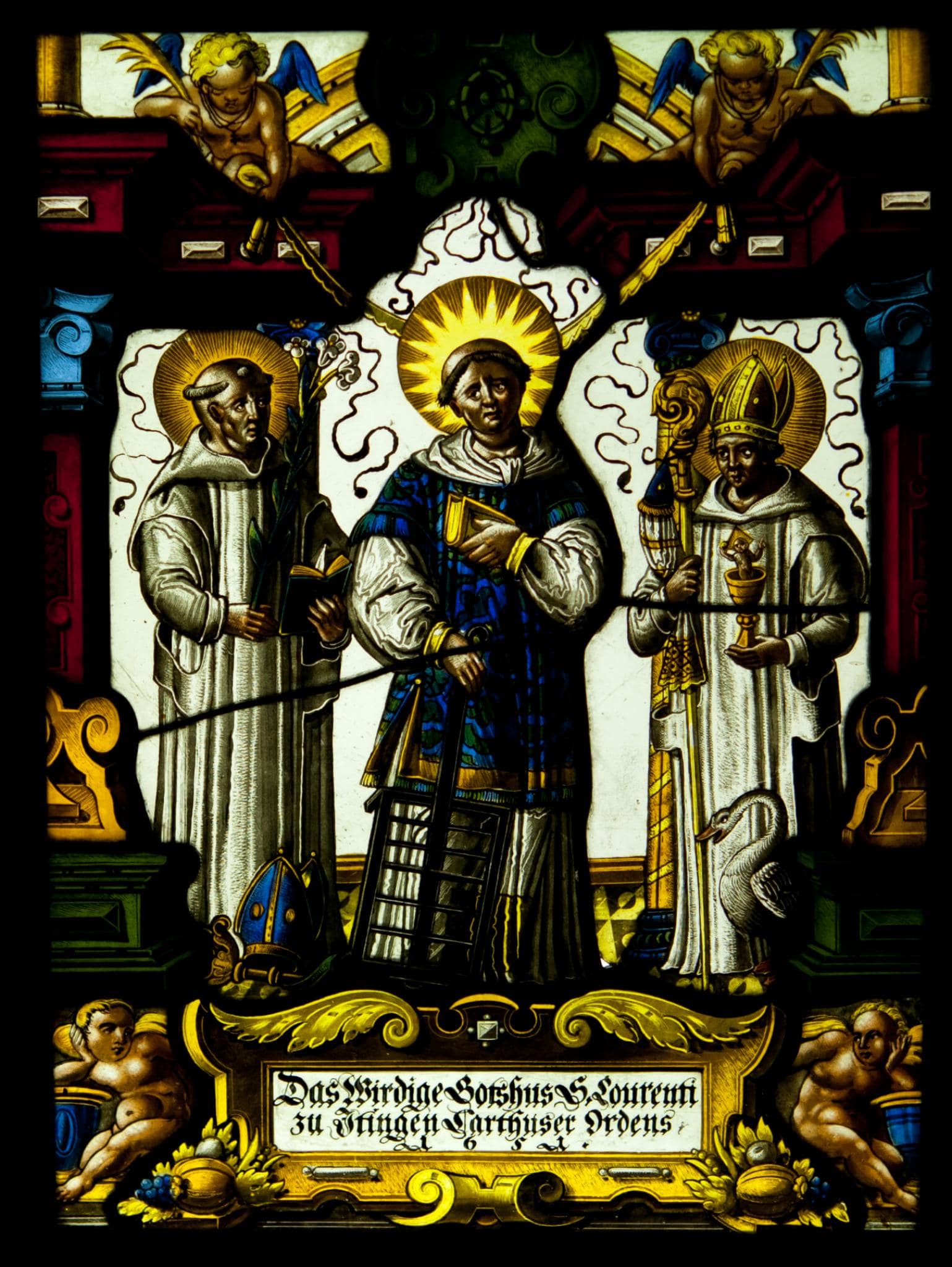 Auf dem gefliestem Boden des Podiums stehend, sind die Heiligen Laurentius, Bruno und Hugo vor weissem, schnurverziertem Grund ins Zentrum der Scheibe gesetzt. Der die Mitte einnehmende Klosterpatron, der hl. Laurentius, ist als Diakon in einer Alba und blauen Dalmatika dargestellt. In seinen Händen hält er den Rost, sein Marterwerkzeug, sowie ein Buch. Begleitet wird er zu seiner Rechten vom hl. Bruno, dem Gründer des Kartäuserordens. In seine weisse Ordenstracht gehüllt, erscheint dieser mit Buch und (Lilien-?)Zweig in seinen Händen, sowie mit Stab und Mitra zu seinen Füssen, das heisst mit den beiden Insignien, deren Annahme er ablehnte. In die gleiche Tracht gehüllt ist der Kartäuserheilige Hugo von Lincoln auf der gegenüberliegenden Seite. Als Bischof von Lincoln zeichnen ihn Pontifikalstab und Mitra aus. Der Kelch mit dem daraus steigenden Jesuskind in seiner linken Hand bezieht sich auf die Legende, wonach er beim Vollzug der Eucharistie diese Erscheinung gehabt haben soll. Der Schwan zu seinen Füssen soll zudem sein treuer Begleiter und Beschützer gewesen sein. Die drei Heiligenfiguren umfasst eine vornehmlich in roter Farbe gehaltene Architekurrahmung, auf deren Gebälkteilen zwei ein gelbes Band haltende Putten sitzen. Zwei weitere Putten befinden sich in den unteren Ecken zu Seiten der die Stifterinschrift enthaltenden Rollwerkkartusche.