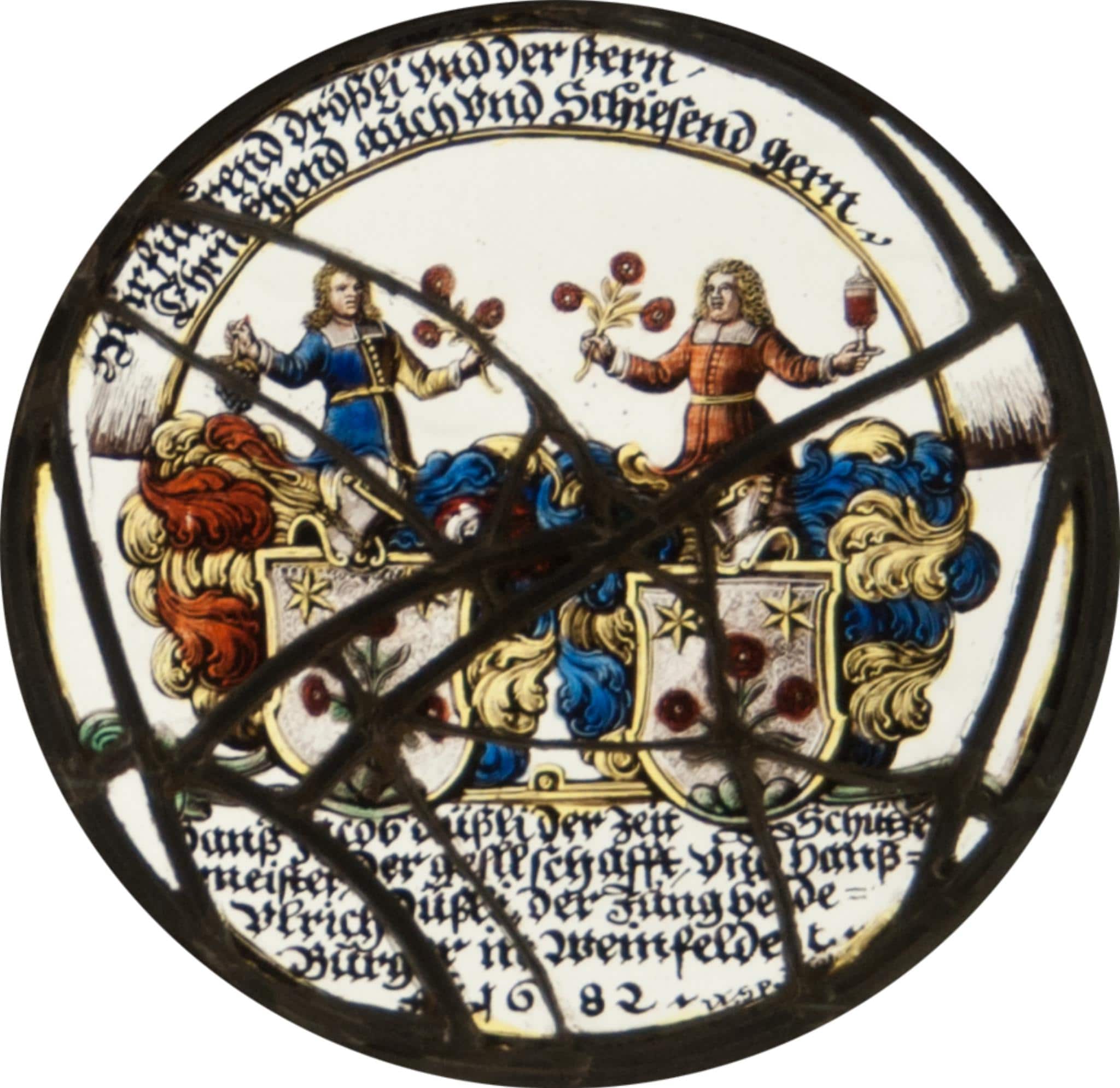 Der 1682 erfolgte Neubau des Weinfelder Schützenhauses bot Anlass zu zahlreichen Fenster- und Wappenstiftungen. Dies belegt das vom damaligen Schützenmeister Hans Jakob Düssli angelegte Protokoll, worin dieser insgesamt sechzehn 1682 dorthin verehrte Fenster mit Angabe ihrer Stifter verzeichnete. Wie daraus hervorgeht, schenkte jedes Mitglied der Musketenschützengesellschaft allein oder mit einem Kollegen ein Fenster mit seinem Wappen in deren neues Haus. Die meisten der Stifter finden sich mit ihrem Wappen auch auf dem Glasgemälde, das die Gesellschaft für dort anfertigen liess (TG_79). Als Schöpfer der 1682 entstandenen Scheibenfolge für das Weinfelder Schützenhaus ist Wolfgang Spengler bezeugt. Seine Signatur zeichnet die meisten der zum Zyklus zählenden Werke aus. Laut der von der Schützengesellschaft aus dem Jahre 1682 erhaltenen Rechnung wurden die betreffenden Scheiben zu 5 Batzen pro Stück in dessen Konstanzer Werkstatt hergestellt und gebrannt (Brüllmann 1947, S. 177f., Anm. 3; Lei 1983). Weil der Zyklus mehrheitlich kleine Rundscheiben mit einem oder zwei Stifterwappen umfasst, muss sich der Stückpreis von 5 Batzen auf diese beziehen. Für die beiden den Zyklus vervollständigenden grossen rechteckigen Glasgemälde, welche die Schützengesellschaft selbst (TG_79) sowie Zürichs Obervogt Hans Kaspar Hirzel (TG_1457) bei Spengler in Auftrag gaben, wird dieser hingegen bestimmt mehr verlangt haben.