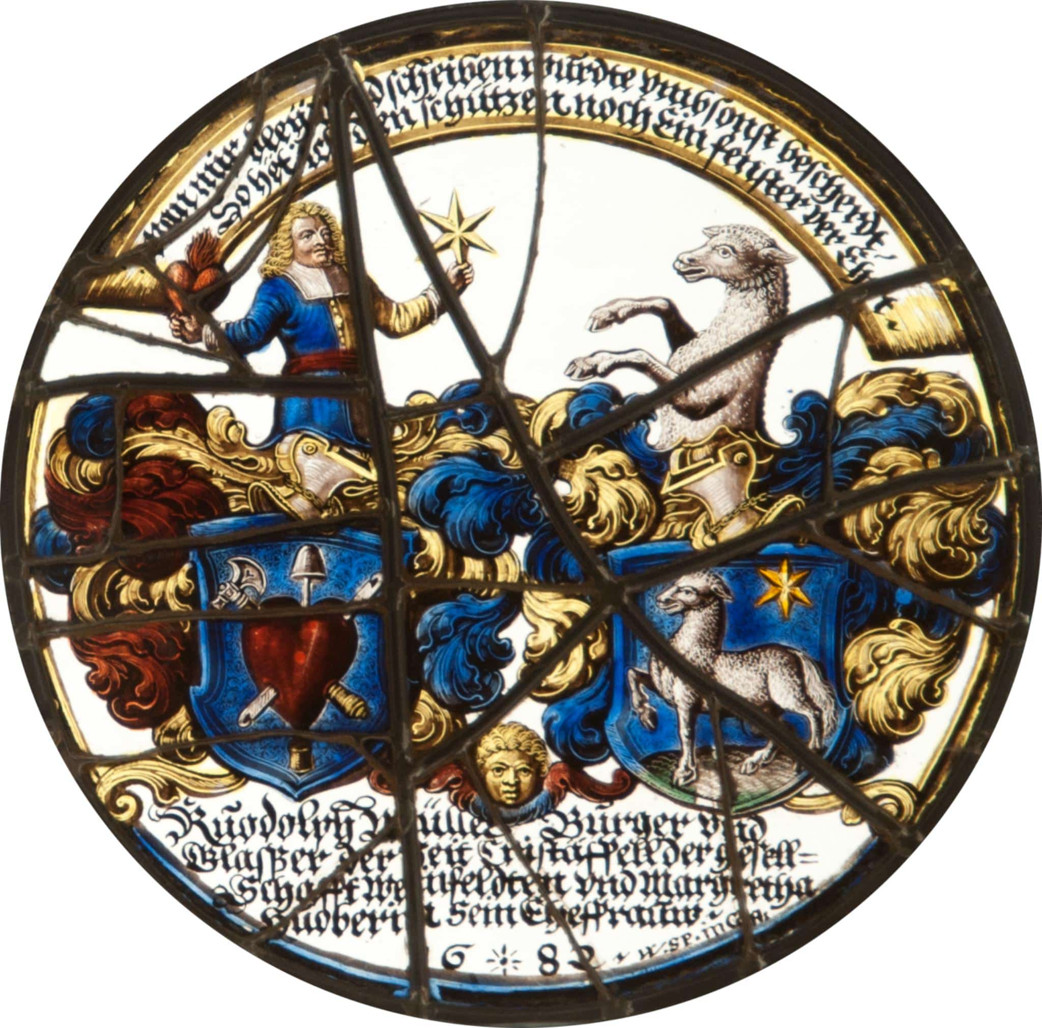 Ruodolph Müller. Burger vnd / Glaßer der Zeit Christäffell der gesell= / Schafft We[i]nfeldten vnd ma[r]gretha / Huoberin sein Eheffrauw. / [1]6 · 82. (in eckigen Klammern die durch Sprungbleie verdeckten Buchstaben)