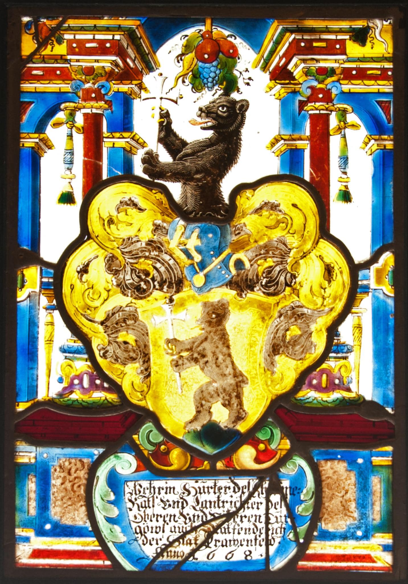 Demnach erhielt der Glasmaler von Wil im August 1668 den Lohn für 12 “schilt”, die er im Auftrag des Rates von Frauenfeld für in den vordern Strasshof hergestellt hatte. Zu diesem Zyklus gehörten neben einer Stadtscheibe weitere Scheiben von Amtspersonen, etwa den Mitgliedern des Kleinen Rats. Die vorliegende, 1668 entstandene Scheibe des Landrichters und Ratsmitglieds Werner Hurter war sehr wahrscheinlich diesem Zyklus zugehörig. Bestätigen lässt sich dies durch den Stil der Glasmalerei. Bei dem in der Quelle genannten Wiler Glasmaler muss es sich um Hans Caspar Gallati (1633–1699), den einzigen damals tätigen Wiler Glasmaler, handeln. Die vorliegende Scheibe des Werner Hurter weist nun enge stilistische Parallelen zu Gallatis signierten Werken auf (vgl. die Rundscheiben von 1672 im Brunnerhaus in Glarus, Klöti-Grob, 1967, Nr. 84–87; Willkommscheibe Hans Wendel Scherrer und Anna Rüdlinger, Victoria and Albert Museum, Inv. Nr. C.379-1926, collections.vam.ac.uk, 2020; TG_1656; TG_54; TG_295; Wappenscheiben für Johann Adam Keller und Fridolin Freuler von 1679, Ithaca College, New York, Parsons Lillich, 2004, Kat. Nr. IC 8 und 9).