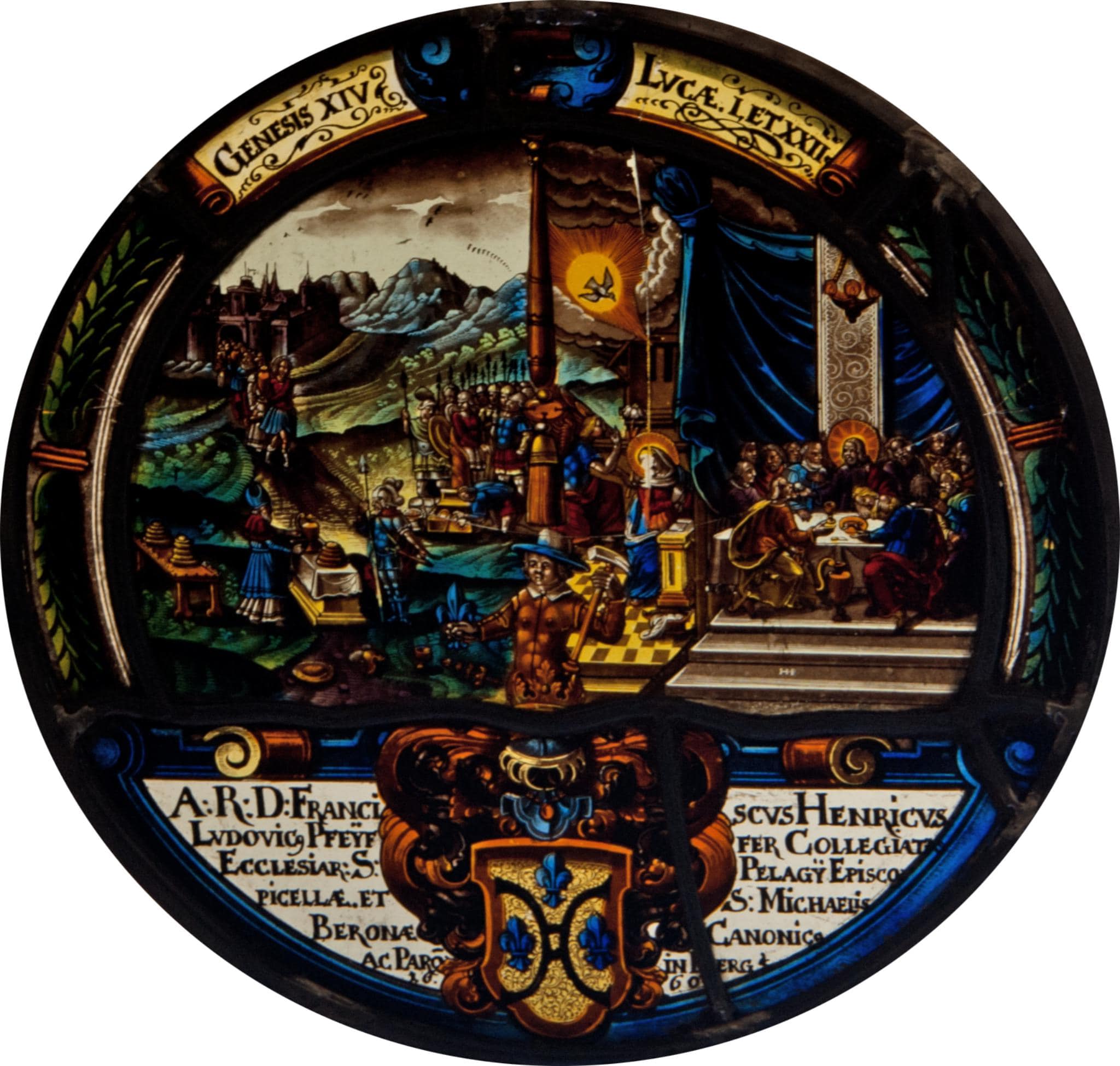 Die sechs stilistisch einheitlichen Scheiben können aufgrund der auf der Stiftung von Franz Heinrich Ludwig Pfyffer vorhandenen Meistersignatur HHP dem Luzerner Glasmaler Hans Heinrich Probstatt zugewiesen werden. Der Besteller dieser Scheibe, Chorherr Pfyffer aus Luzern, war es wohl auch, der Probstatt in seiner Heimatstadt den entsprechenden Auftrag zuhielt. Dieser komponierte alle sechs Werke in analoger Weise, indem er im unteren Drittel jeweils das Wappen mit der Stifterinschrift und darüber die von einem Lorbeerkranz und einer Schriftrolle mit der Bildlegende umrahmte biblische Darstellung festhielt. Diese biblischen Darstellungen beruhen auf den zehn Kupferstichen, die Léonard Gaultier (1561–1641) für Guillaume de Requieus “Conférence des figures mystiques” [1602] schuf. Die Stiche zeigen Begebenheiten aus dem Alten und Neuen Testament, die einander gegenüber gestellt werden. De Requieus theologisches, antiprotestantisches Traktat diskutiert die aus der Gegenüberstellung entstehenden Bezüge (vgl. Engert, 2018, S. 157). Tamara Engert untersuchte jüngst die nach denselben Vorlagen zwischen 1612 und 1622 geschaffenen monumentalen Glasmalereien in der Kirche Saint-Etienne-du-Mont in Paris. Die Darstellung auf der vorliegenden Rundscheibe entspricht bis ins Detail dem “tableau V” aus der “Conférence”, nur wurde die Komposition von einem Hochformat in ein Querformat übertragen und der zentrale Stab als Gliederungselement eingefügt. Der in der Verkündigung verheissene Christus erscheint als Nachfolger Melchisedechs und dessen Gabe von Brot und Wein an Abraham (Gn 14) als Präfiguration des Abendmahls (vgl. Engert, 2018, Abb. 193, S. 205).
