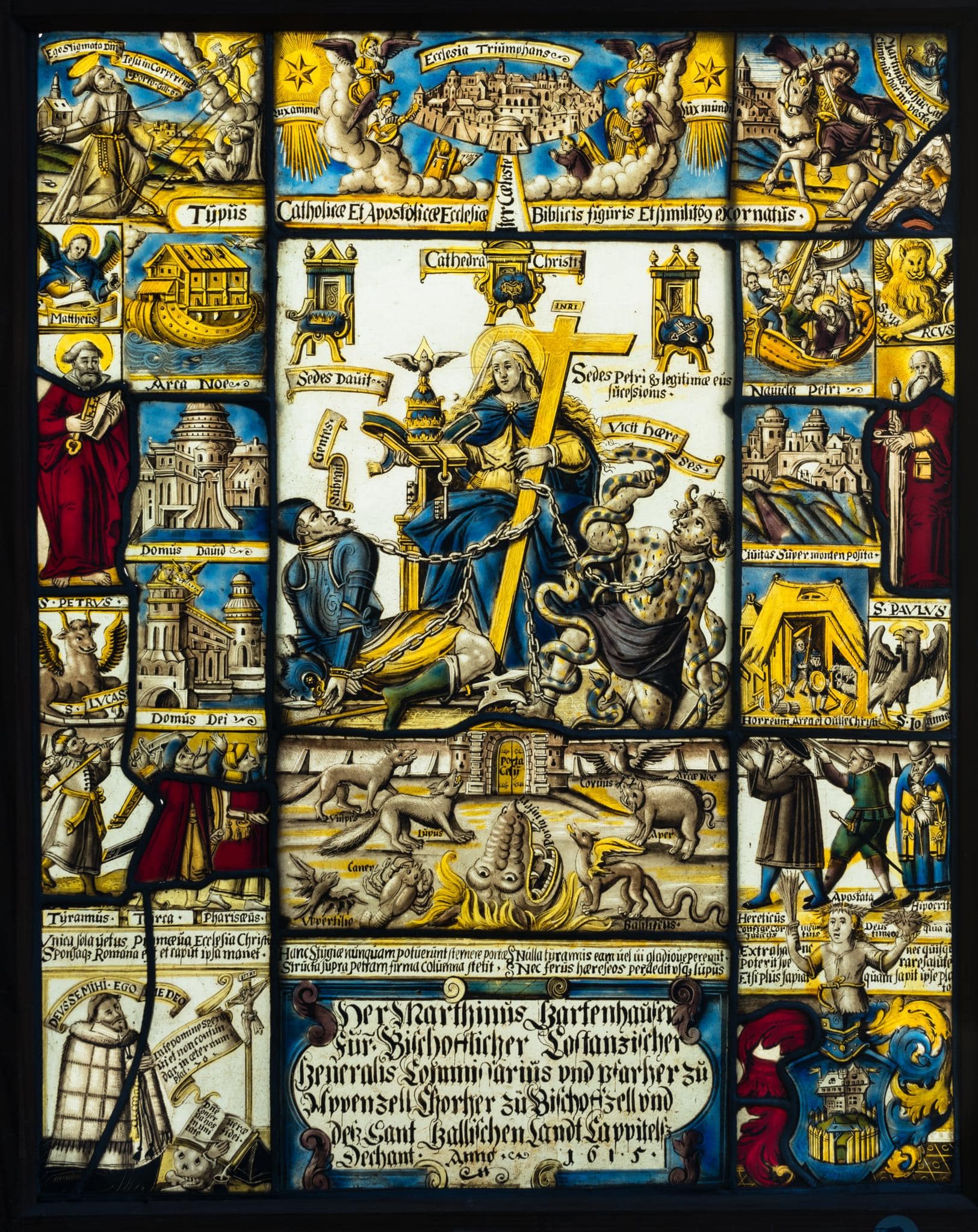 Das Mittelstück der Scheibe zeigt die Personifikation der katholischen Kirche mit den Attributen des Kreuzes, der Petrusschlüssel und der päpstlichen Tiara, wie sie über die geketteten und knienden Figuren des Heidentums und der Häresie sitzend triumphiert. Über der Mittelgruppe sind klein im leeren Raum die Throne Davids, Christi und Petri verteilt. Den seitlichen Rahmen bilden sechs einander gegenübergestellte biblische Symbole: Arche Noah und Schiff Petri, Burg Davids und Stadt auf dem Berg, Haus Gottes und Schafherde Christi. Eine zweite seitliche Bahn wird durch die Ganzfiguren der Fürstapostel und die Evangelistensymbole gebildet. Den obern Abschluss formt das auf Wolken erscheinende Himmlische Jerusalem, flankiert von zwei Szenen aus dem Leben der Patrone Franziskus und Martin. Unter der Hauptszene umlagern Raubtiere das verschlossene Himmelstor und den Höllenrachen, aus den seitliche Zwickeln greifen sechs Gegner an, von links Tyrann, Türke und Pharisäer, von rechts Häretiker, Apostat und Heuchler. Das untere Register nimmt den Stifter in Chorherrentracht, die Inschrift und das Wappen auf. Das Ganze wird durch lateinische Inschriften ausführlich erläutert (vgl. Fischer, 1973, S. 274f.).