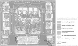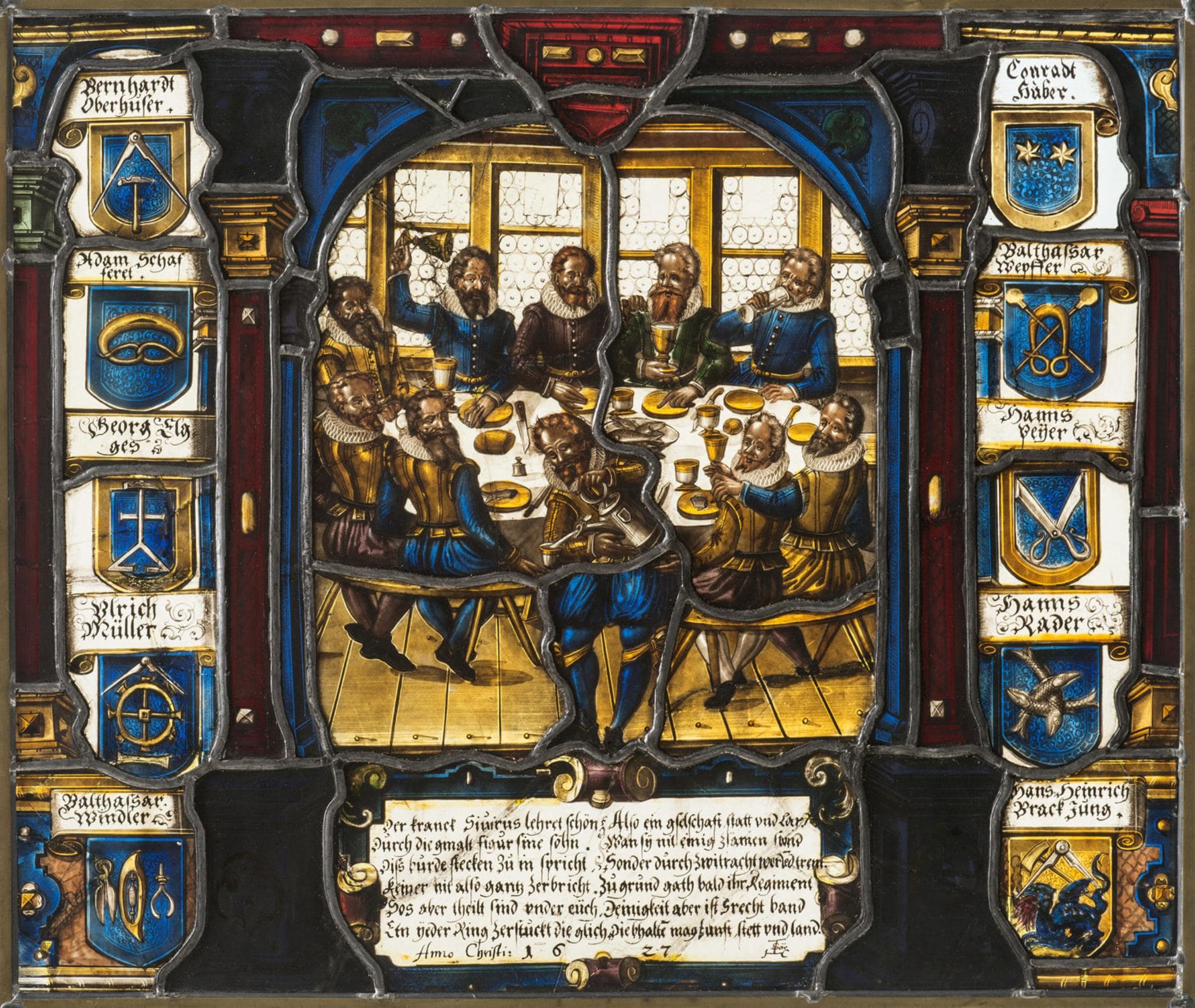 Die durch eine dreiachsige Rahmenarchitektur in ein Haupt- und zwei schmale Seitenfelder unterteilte Scheibe zeigt im Mittelbild die in ihrer Zunftstube im “Leuenhof” an einer reich gedeckten Tafel zum Mahl versammelten Gesellschaftsmitglieder. Einer der zehn Zunftangehörigen steht im Vordergrund der Tafelrunde und giesst aus einer Kanne Wein in einen Becher. Hinter der Tischgesellschaft zieht sich an der Stubenrückwand eine mit Wappenscheiben besetzte Butzenfensterfront hin. Die Wappen der speisenden Männer und deren auf Schriftrollen angebrachten Namen sind je zu fünft in den beiden Seitenfeldern aufgereiht. Die eingeflickte, nicht zugehörige Rollwerkkartusche unterhalb der Figurenszene enthält einen langen Sinnspruch (s.u.) sowie das Stiftungsjahr und die Signatur des Glasmalers.